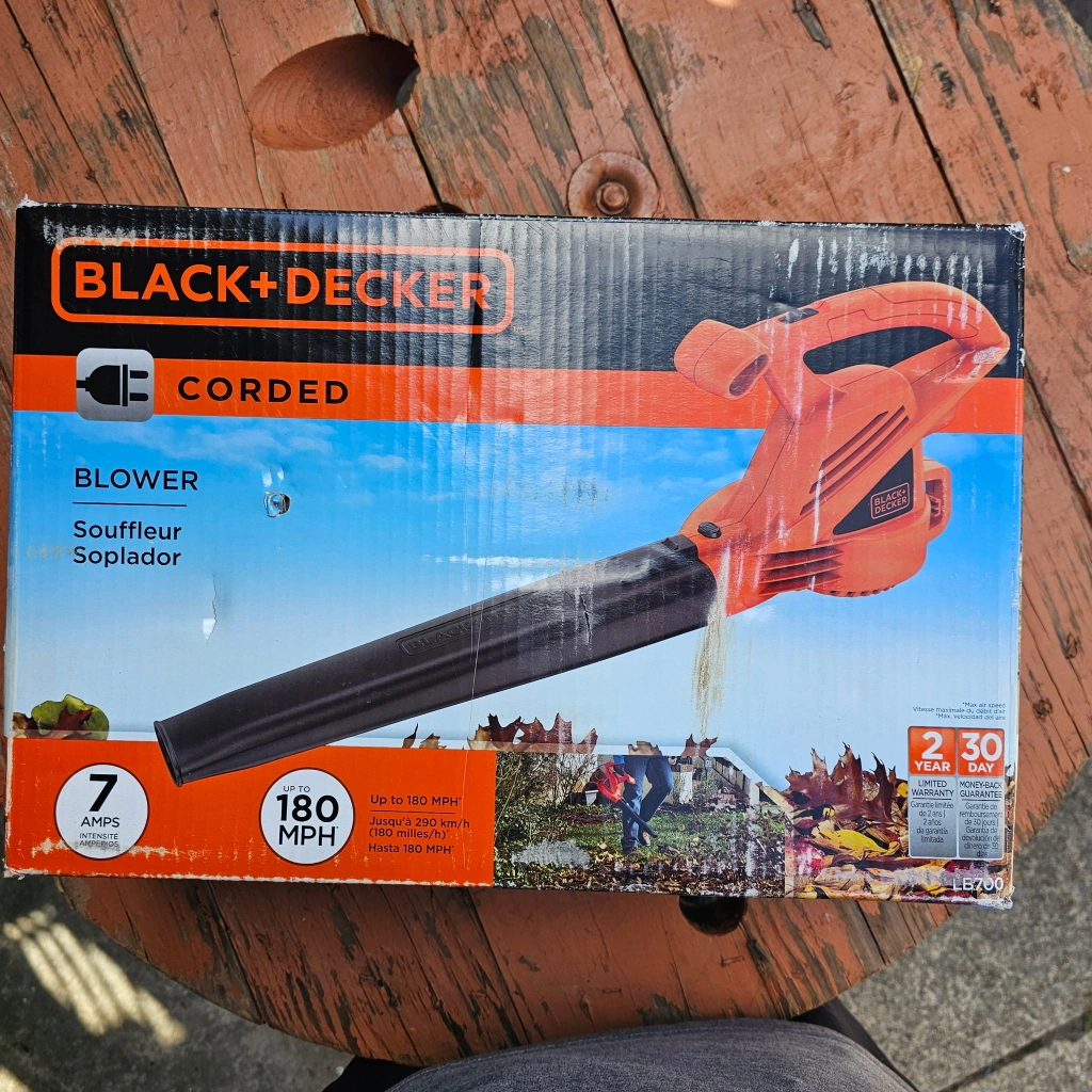 This is a new Black and Decker corded blower capable of up to 180 mph and 7 amps. This blower is perfect for clearing leaves and debris from your yard with ease.