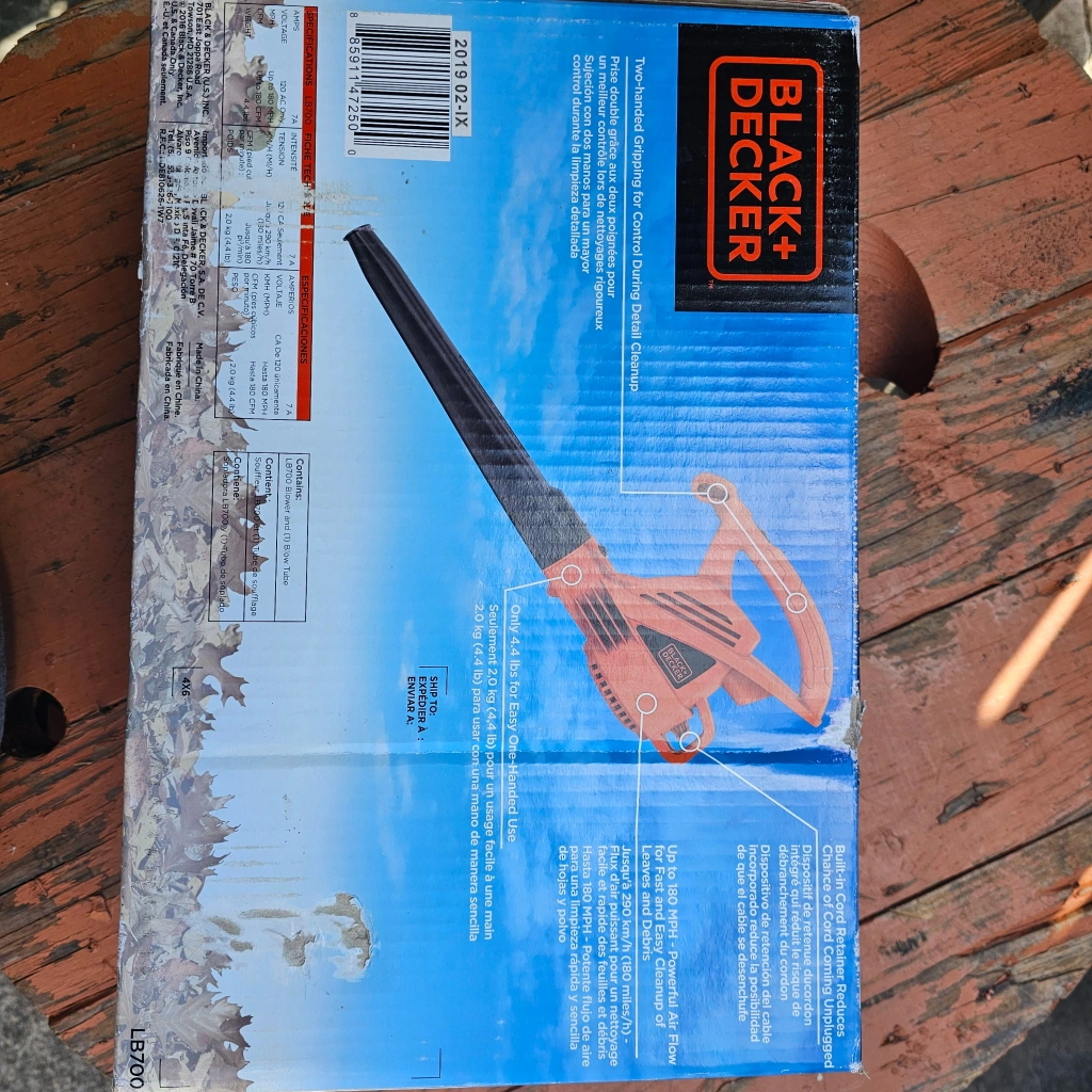 This is a new Black and Decker corded blower capable of up to 180 mph and 7 amps. This blower is perfect for clearing leaves and debris from your yard with ease.