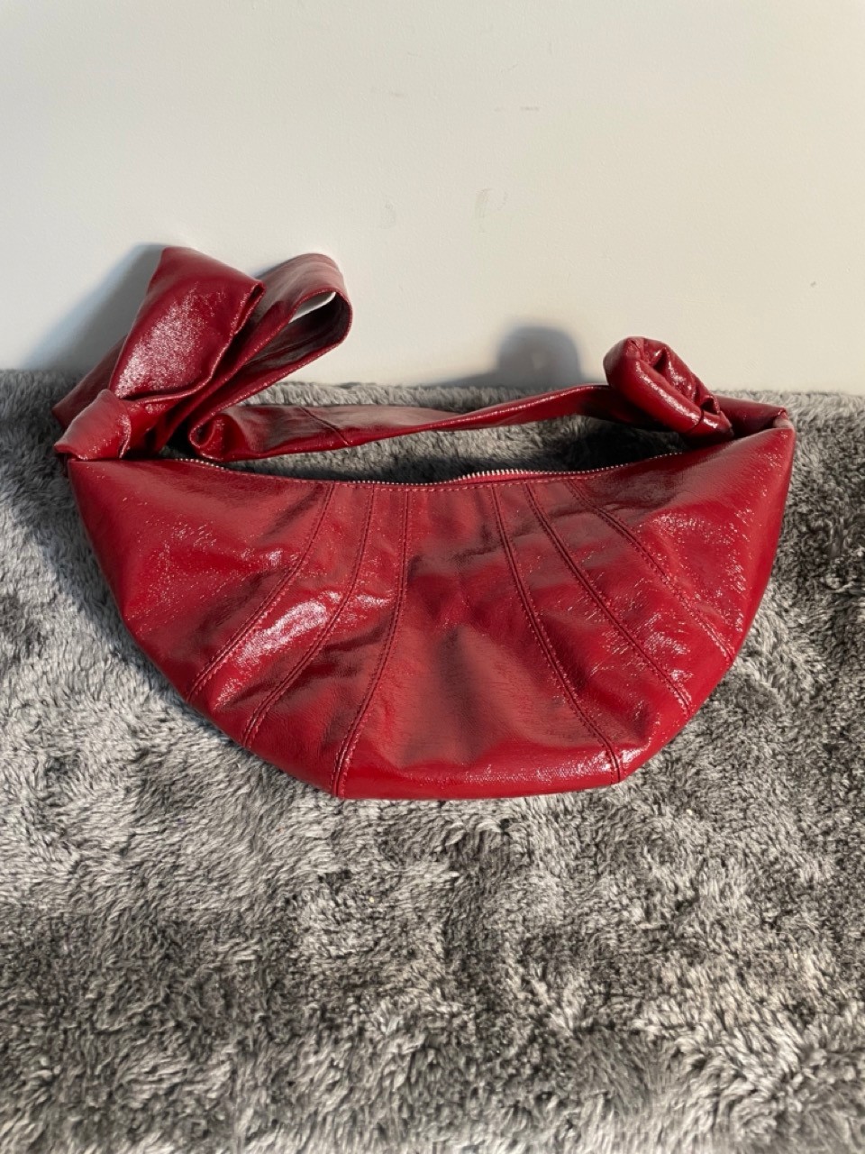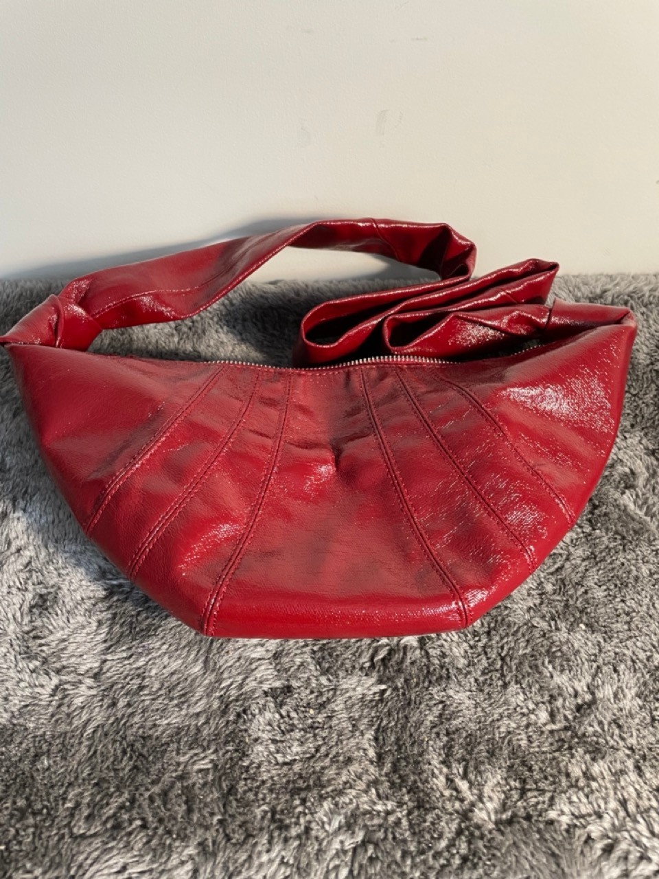 A stylish red leather shoulder bag! It's in great condition and ready to add a pop of colour to your wardrobe. The unique design and shiny finish make it a real eye-catcher
