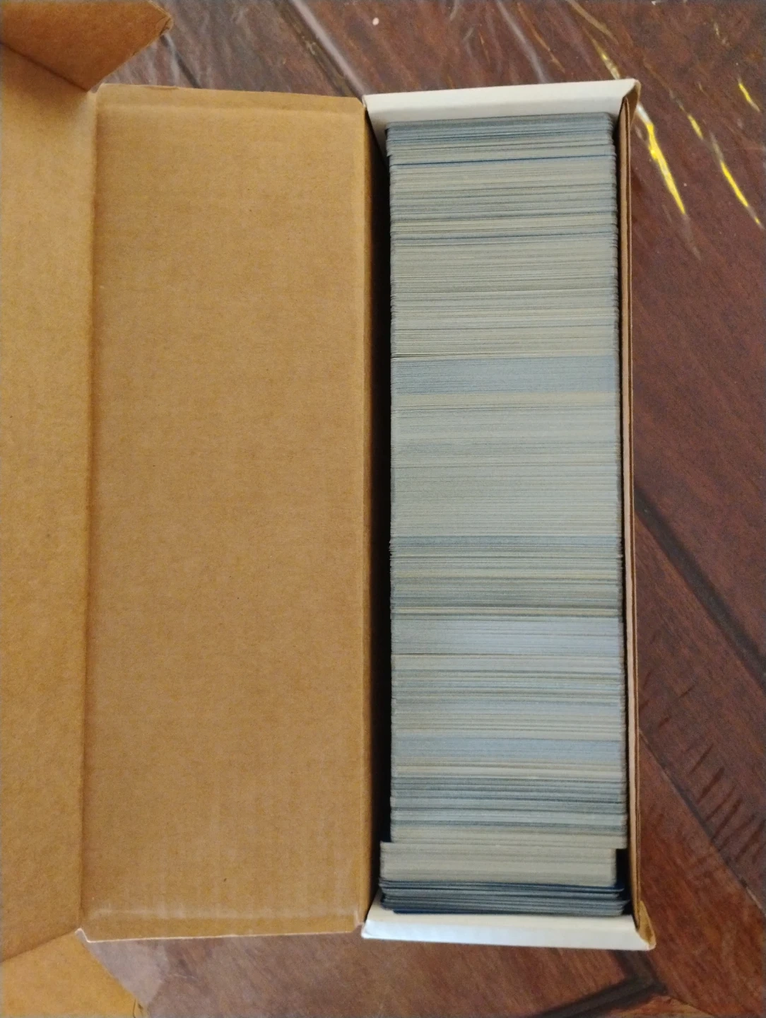 This is a large collection of trading cards stored in a cardboard box. They appear to be standard size cards with blueish-grey backs. This lot is ideal for collectors looking to expand their inventory or for someone wanting to start a new collection.