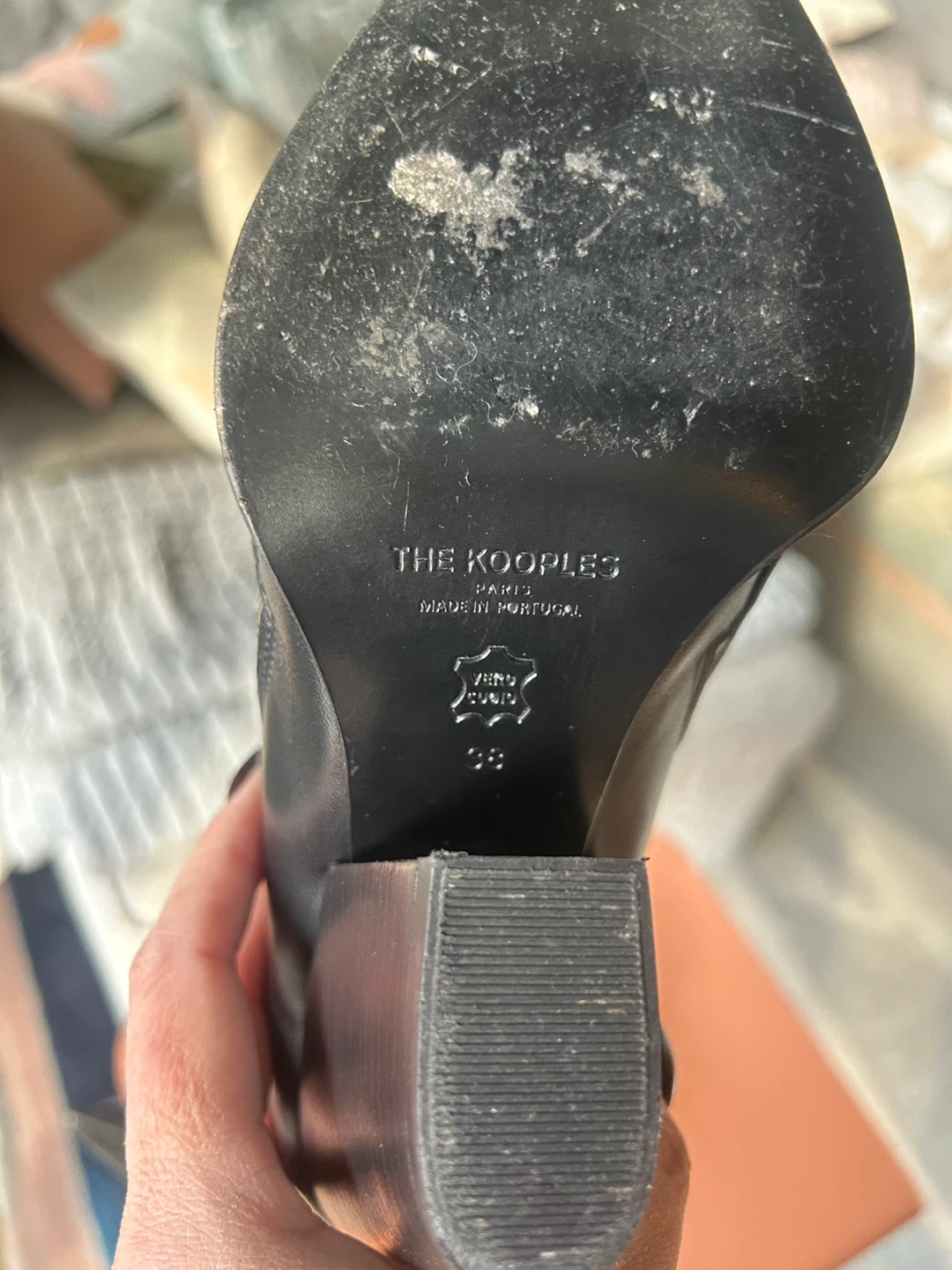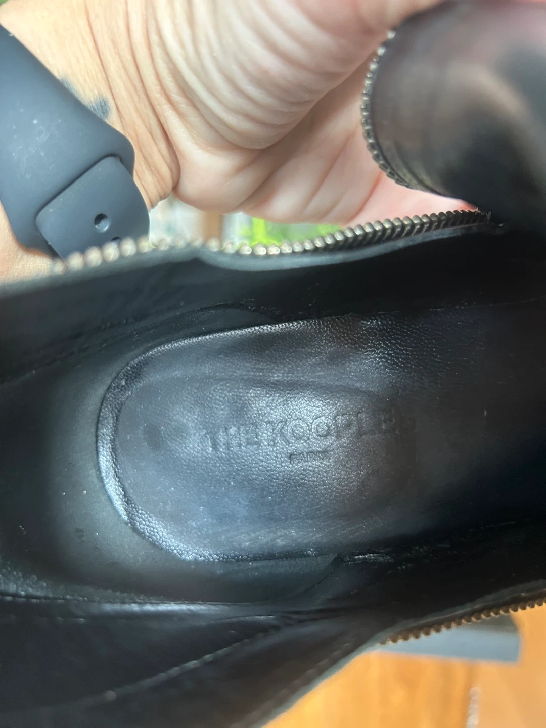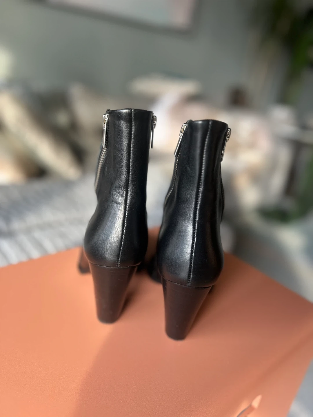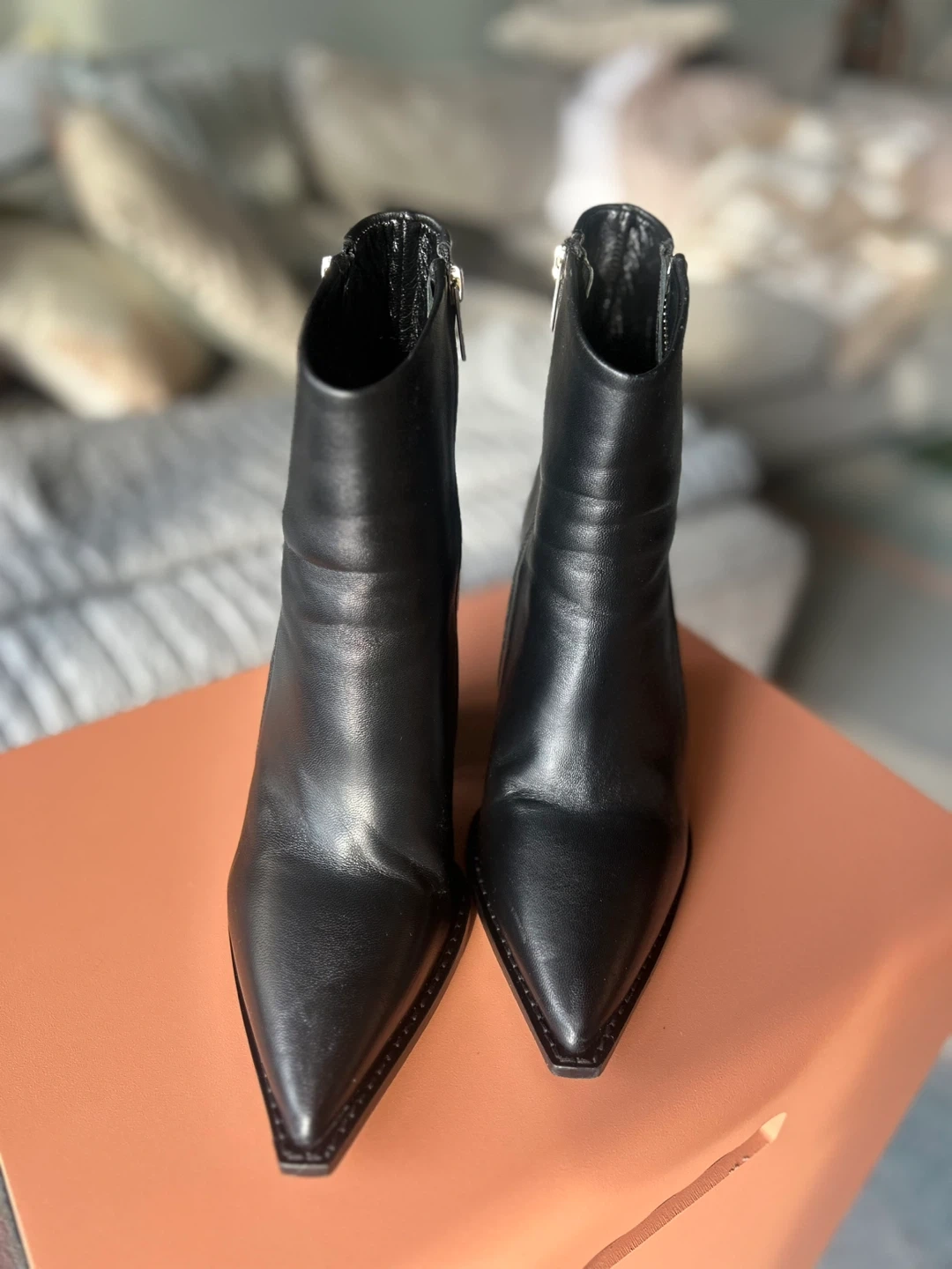 Black leather ankle boots by The Kooples Paris feature a pointed toe and a side zipper on either side of the boot. They're made of genuine leather. Worn only once.