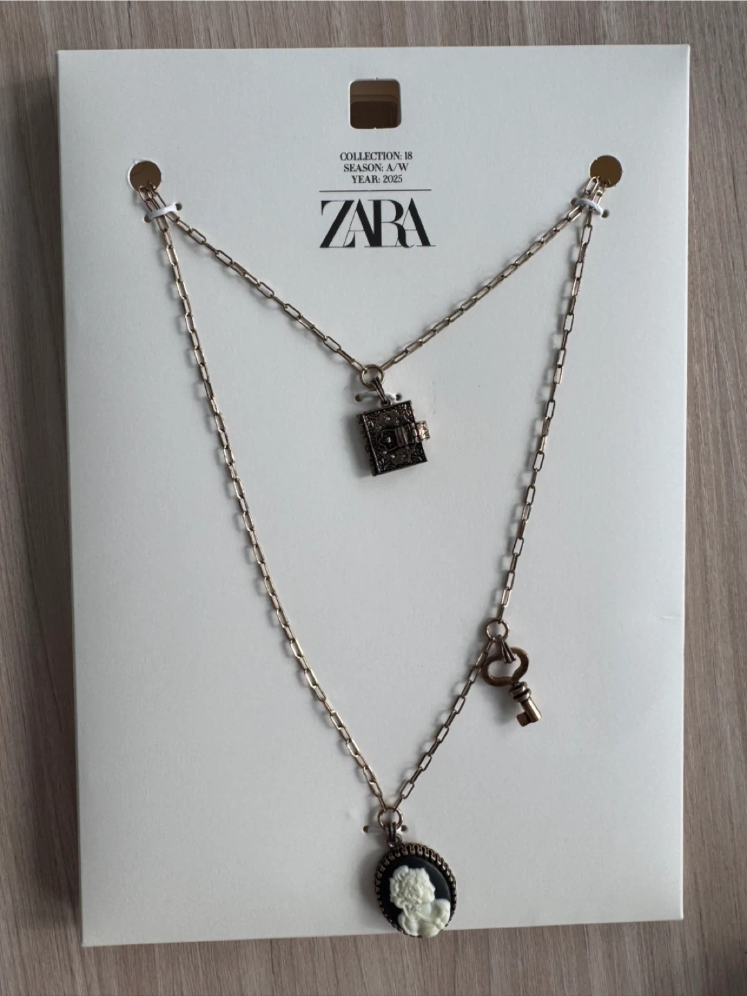 This ZARA layered necklace features a pendant with a cameo design and a dangling key charm. It comes with a drawstring pouch for storage. Collection from year 2025.