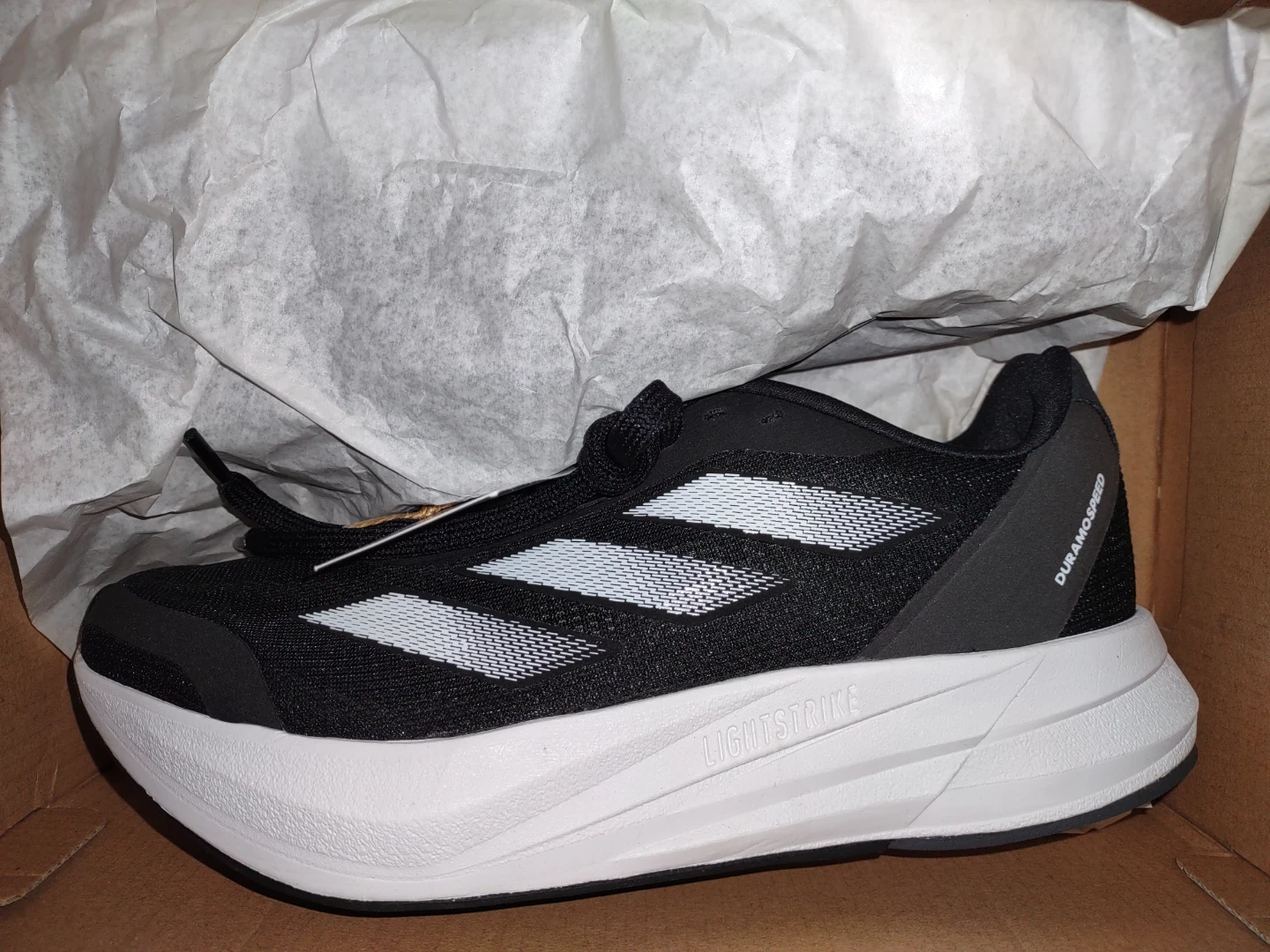 Adidas Duramo Speed W running shoes in black. They're designed for running and have a lightweight feel. The shoes are US size 7 and come with the original box.