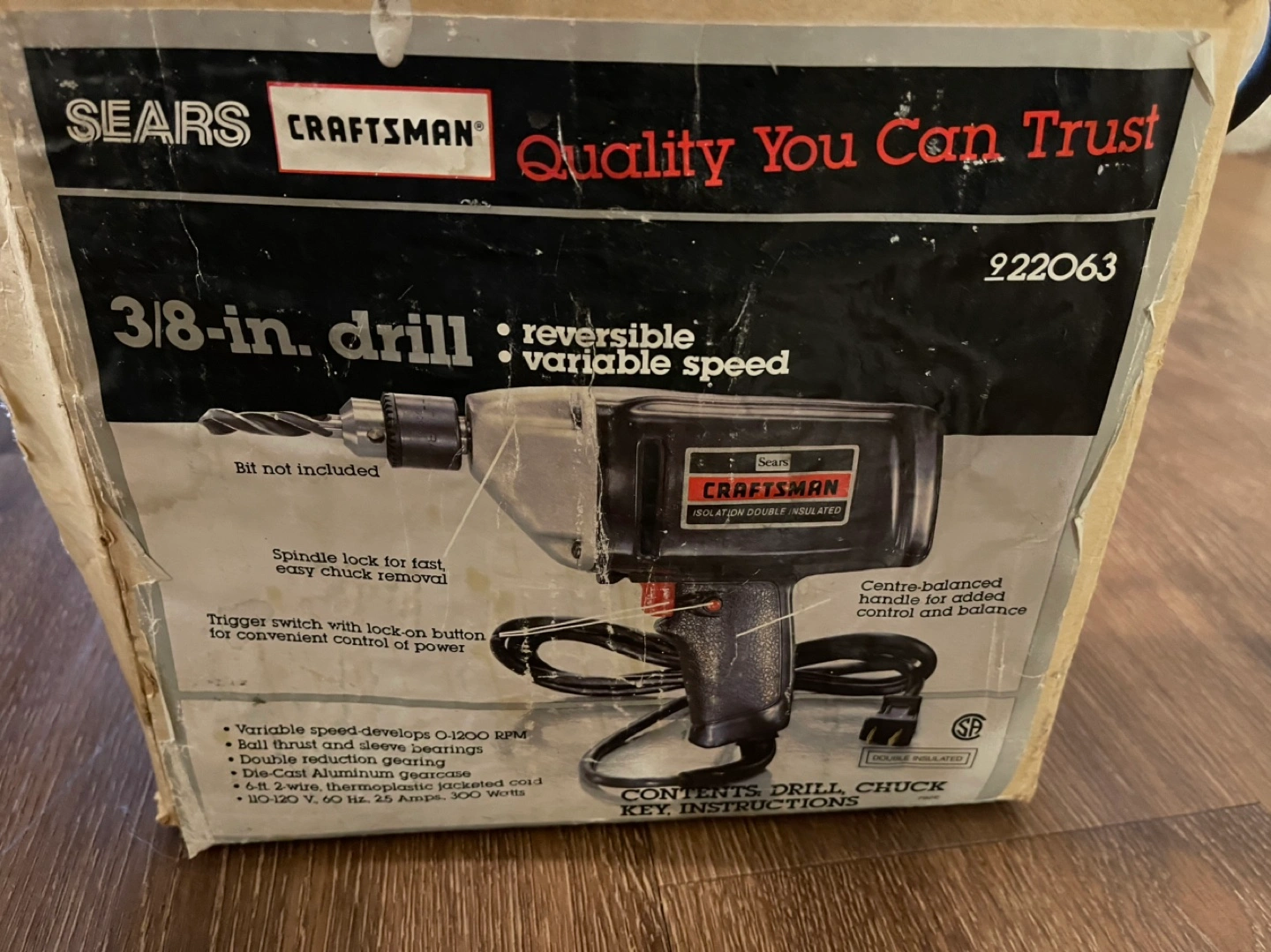 Vintage Craftsman 3/8-inch drill. Variable speed. Centre-balanced handle. Includes drill, chuck, and key. Instructions included. Bit not included.