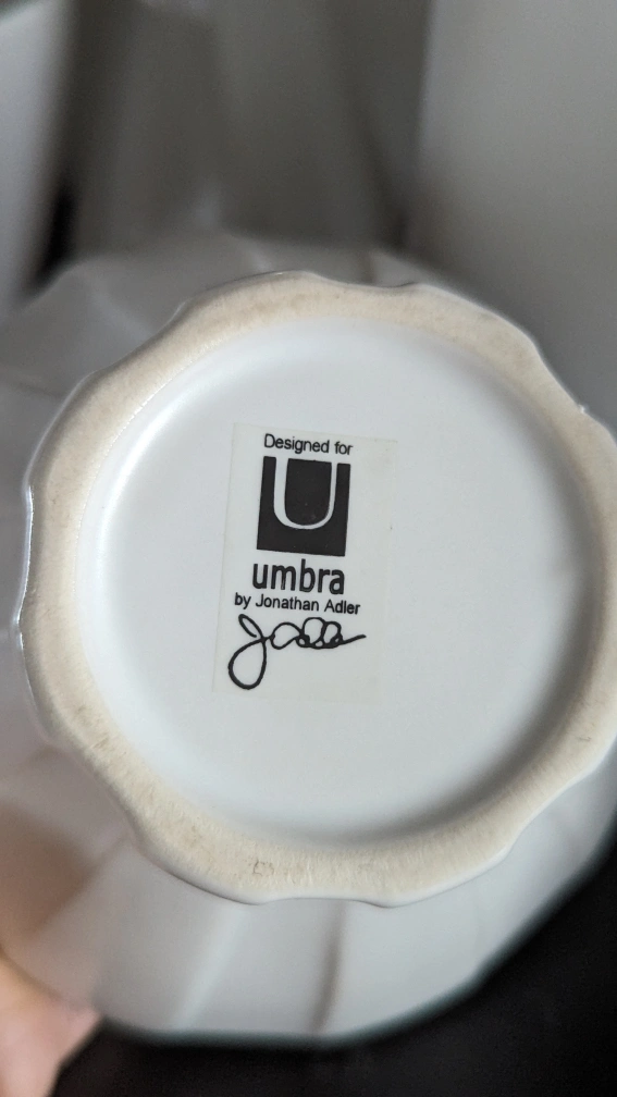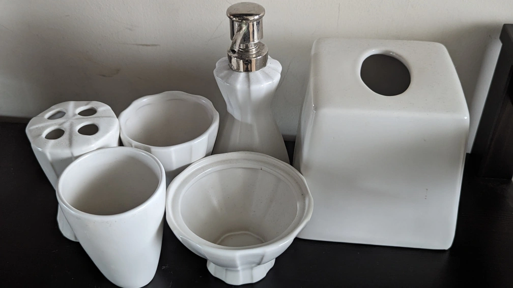 White ceramic bathroom set. Includes a toothbrush holder, two tumblers, a soap dispenser, a dish, and a tissue box holder.
