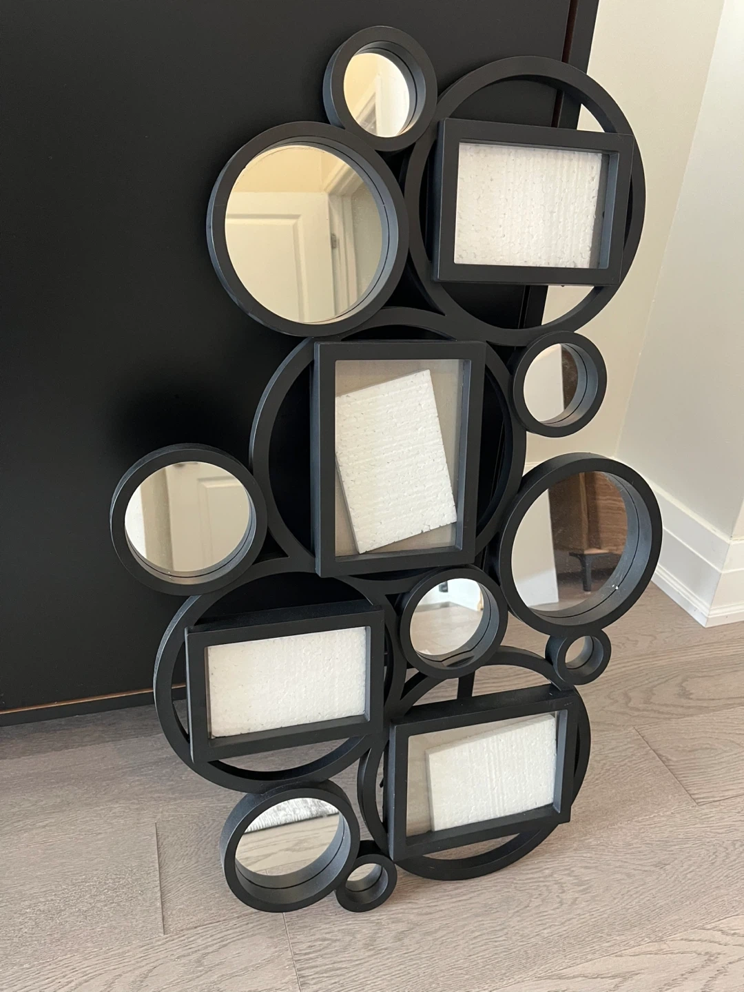 77Selling a unique Umbra Dima decorative wall mirror. It features multiple round and square mirrors in a black frame, creating a stylish and modern look for any room. It's in great condition and ready to add some flair to your home decor! Size is 30” tall x 20 “ wide