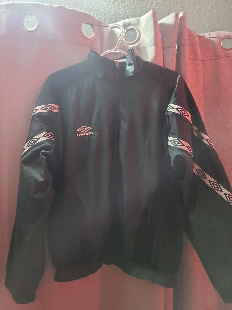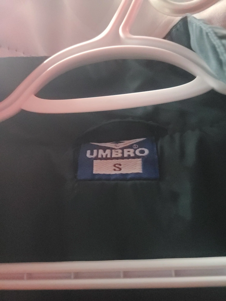Selling a dark green Umbro jacket in size small. It's in great condition and perfect for layering or wearing on its own. The jacket features the classic Umbro logo and design on the sleeves. It's a stylish and comfortable piece for any casual occasion!