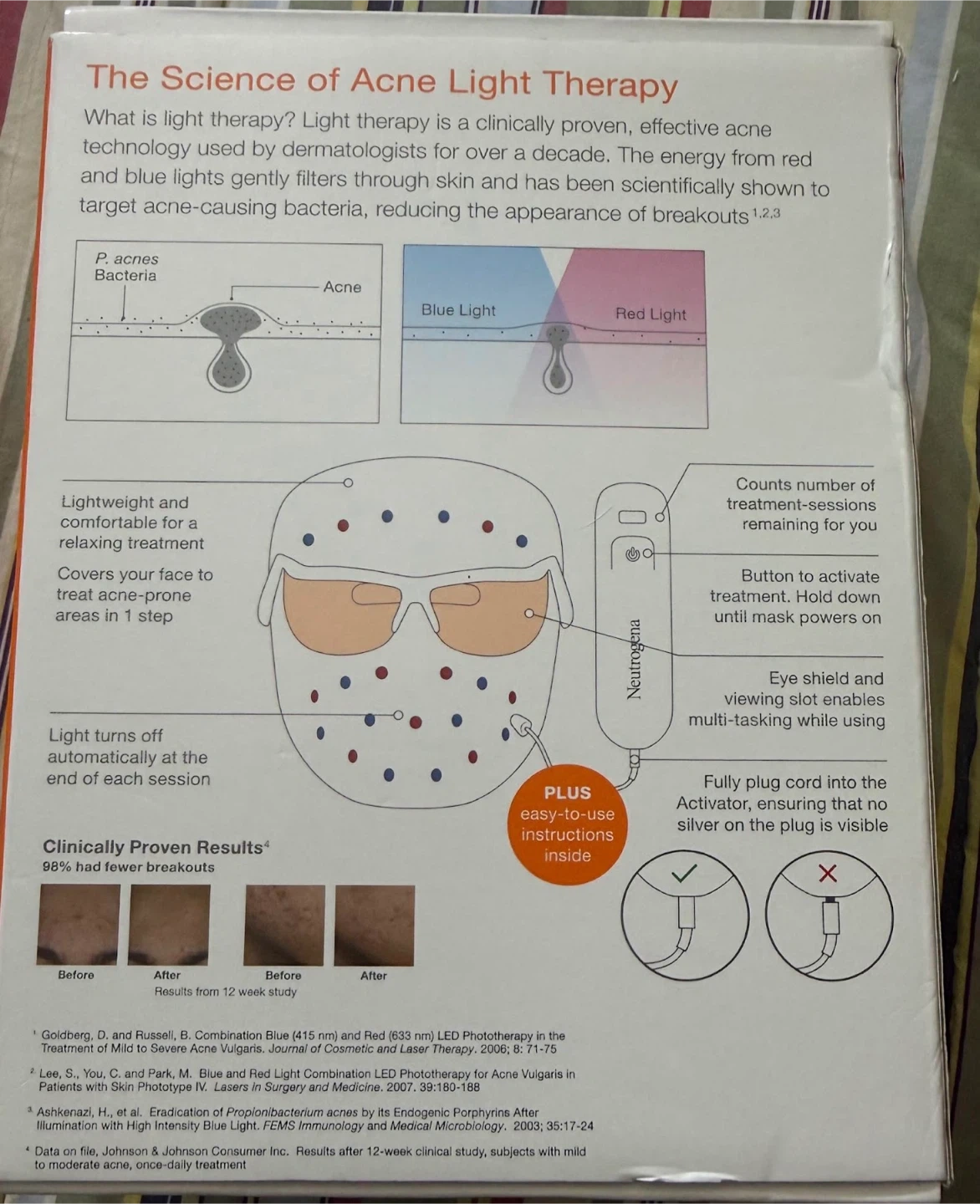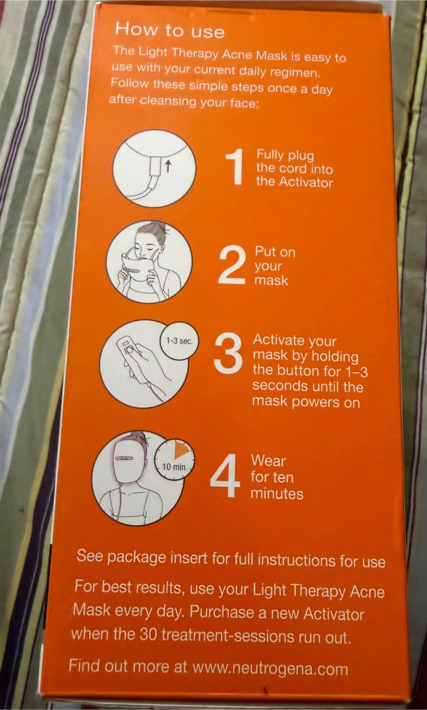 This Neutrogena Light Therapy Acne Mask uses dermatologist-proven technology to treat breakouts. It's lightweight and comfortable for a relaxing treatment. It covers your face and has a button to activate treatment, with auto shut-off. Includes mask, 1 activator, 30 daily treatment sessions, and batteries.