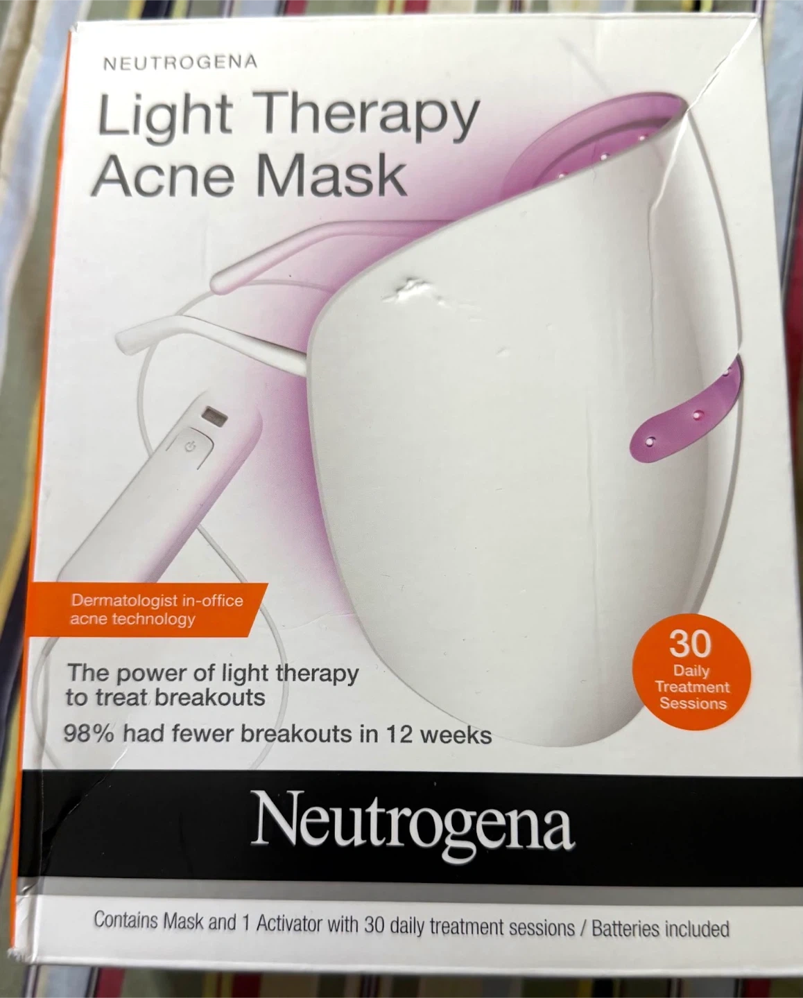 This Neutrogena Light Therapy Acne Mask uses dermatologist-proven technology to treat breakouts. It's lightweight and comfortable for a relaxing treatment. It covers your face and has a button to activate treatment, with auto shut-off. Includes mask, 1 activator, 30 daily treatment sessions, and batteries.