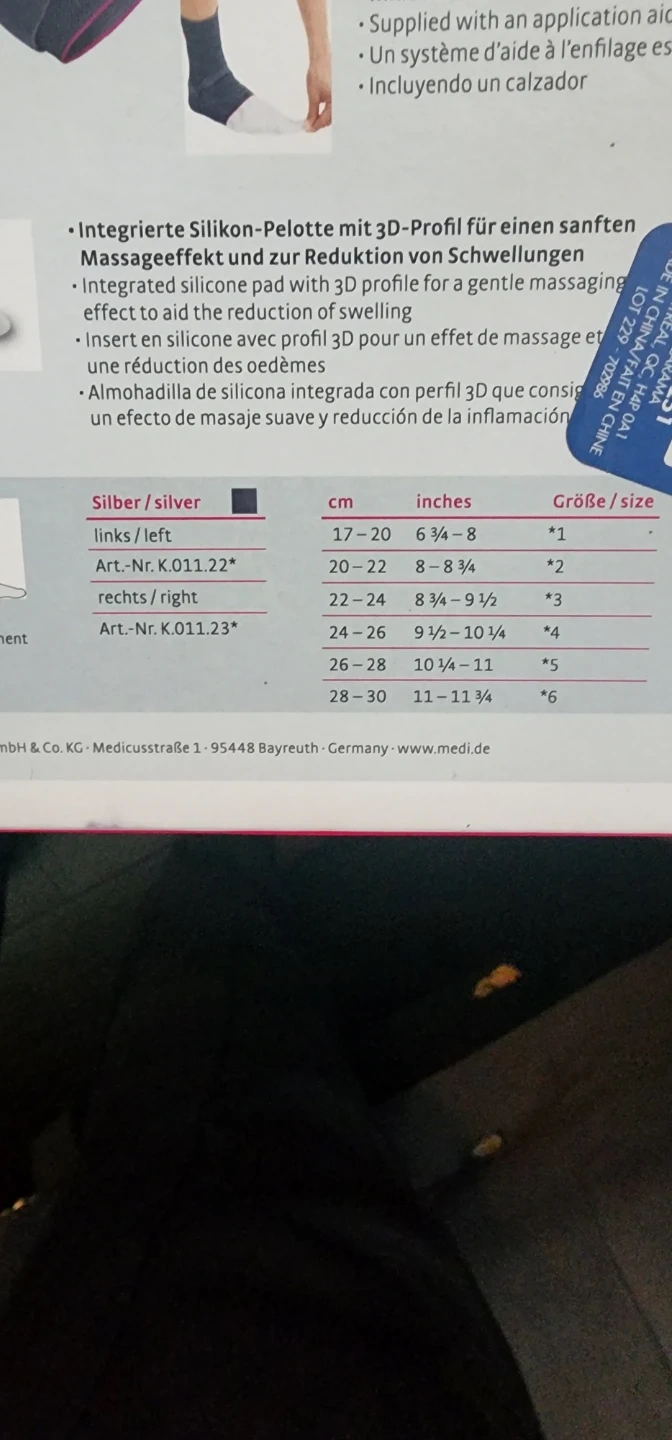 Medi Levamed active ankle support brace for the right foot. It's a size IV in silver and features an integrated silicone pad for massage effect and reduction of swelling. This knitted fabric provides comfort and support.