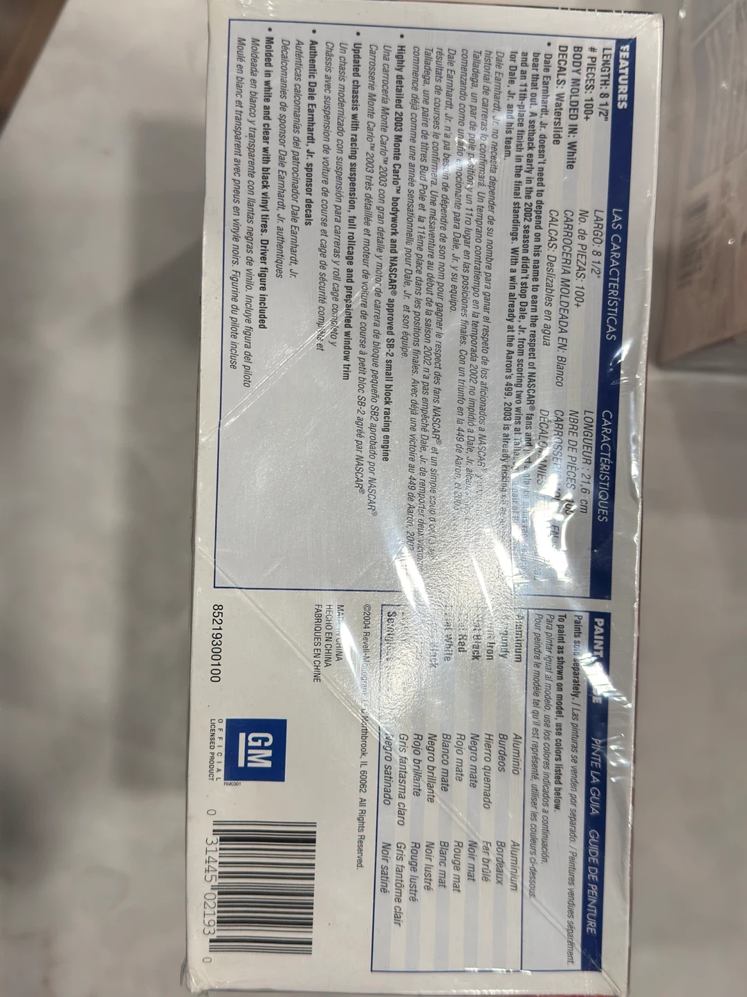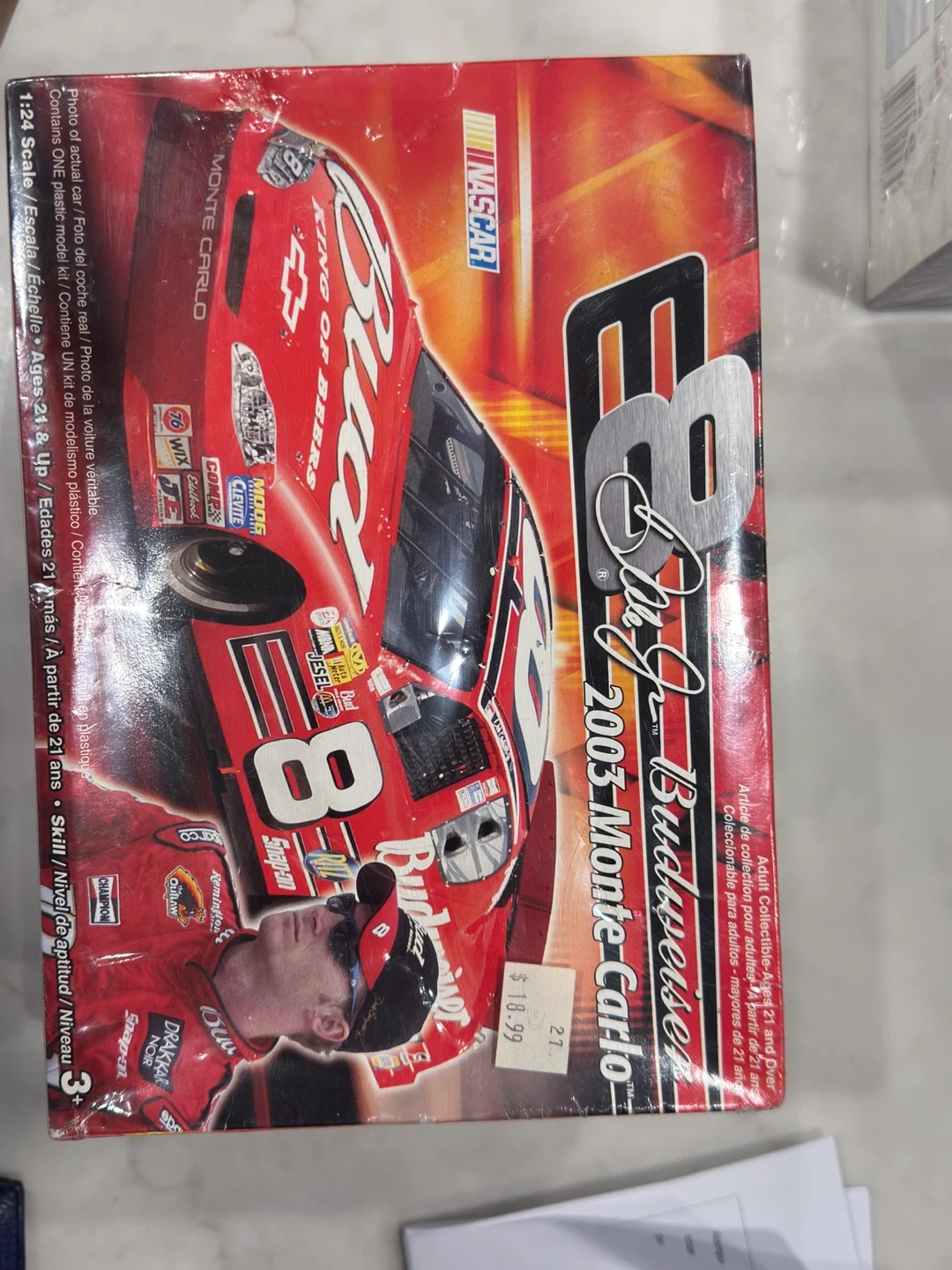 Selling a Dale Earnhardt Jr. #8 Budweiser 2003 Monte Carlo model car kit. It's 1/24 scale and still in the original box! This adult collectible is for ages 21 and up, with a skill level of 3. The box includes driver figures and is molded in white and transparent with clear parts. Features include:
