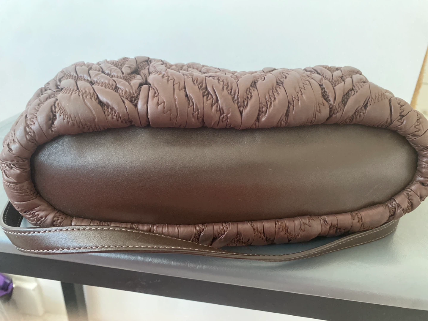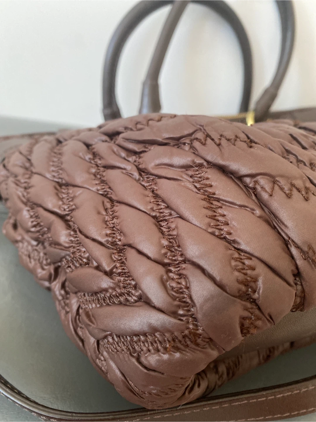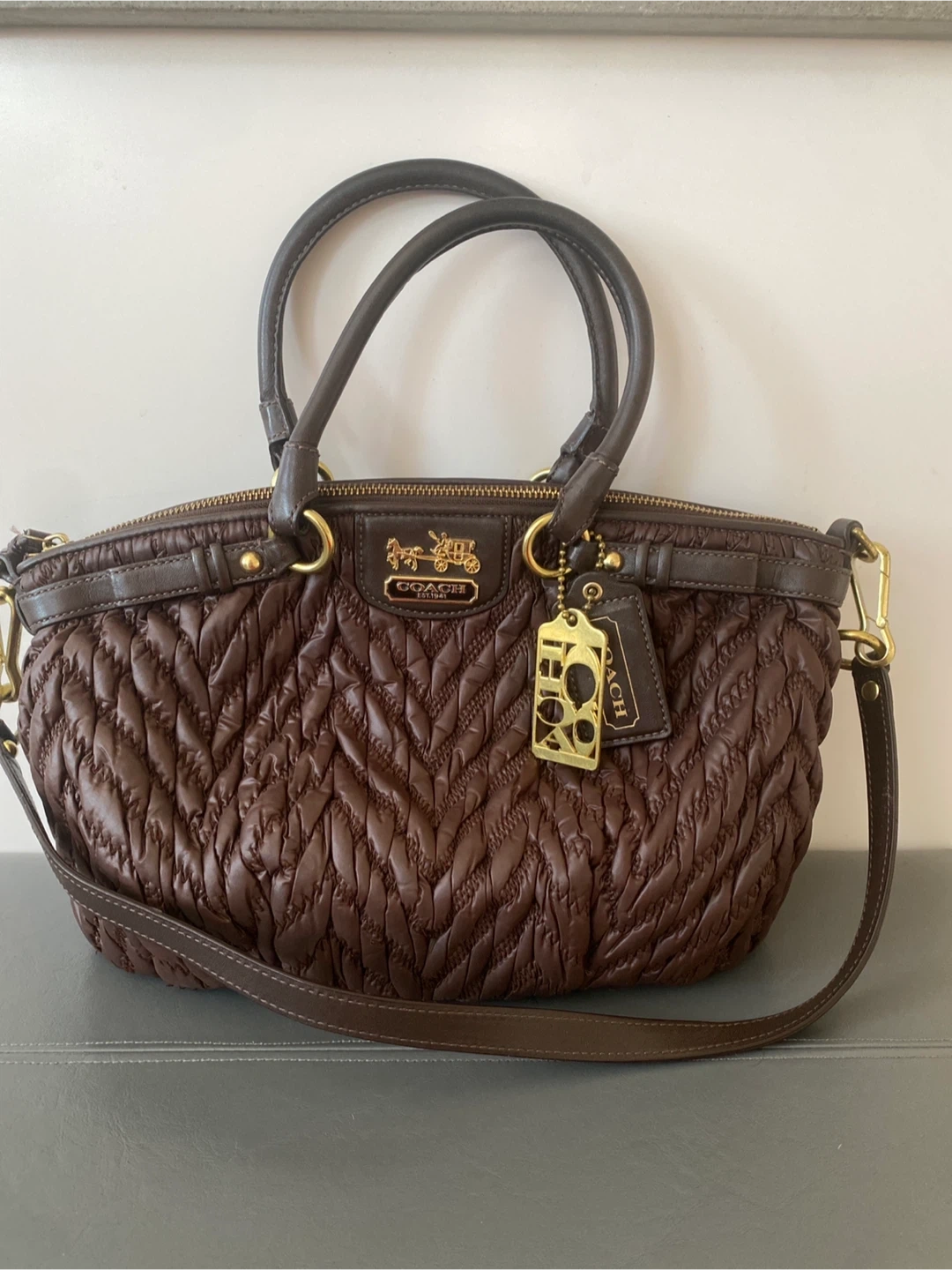 This is a stylish Coach satchel purse in a rich brown colour. It features a ruched, quilted exterior with leather trim and gold-tone hardware. The bag has top handles and an optional shoulder strap for versatility. It's perfect for everyday use!