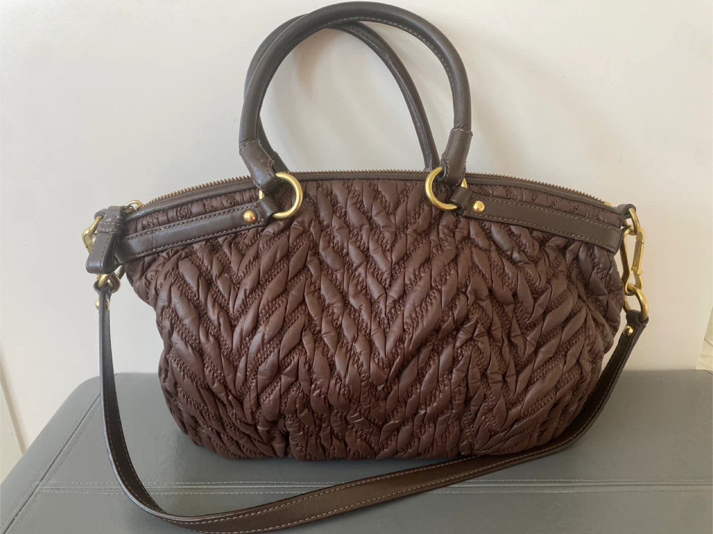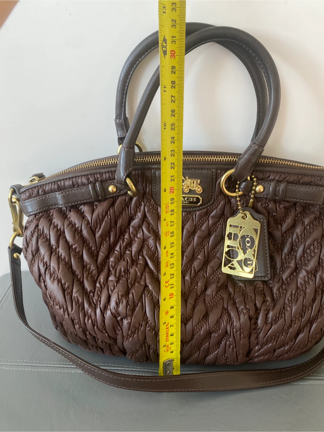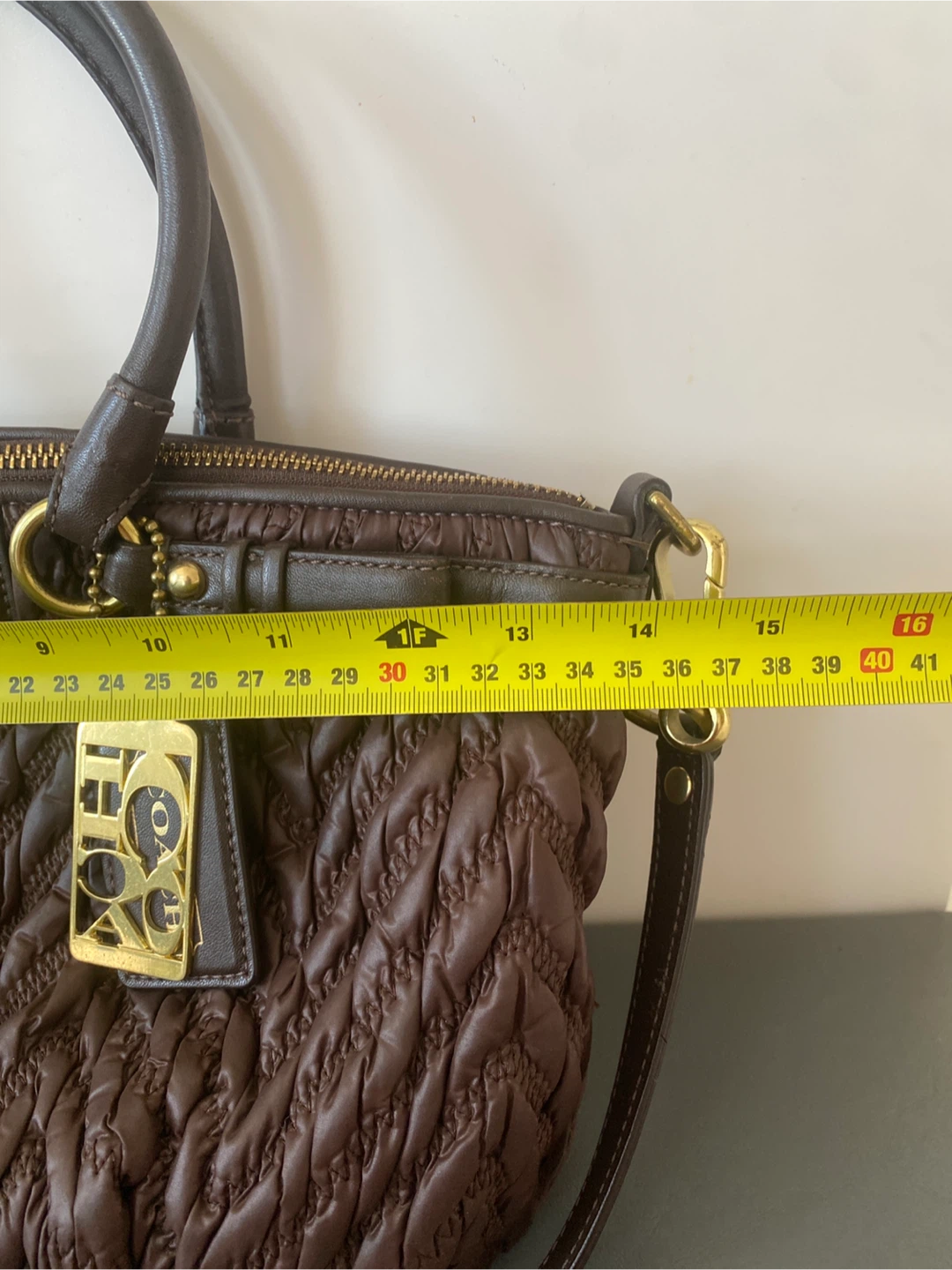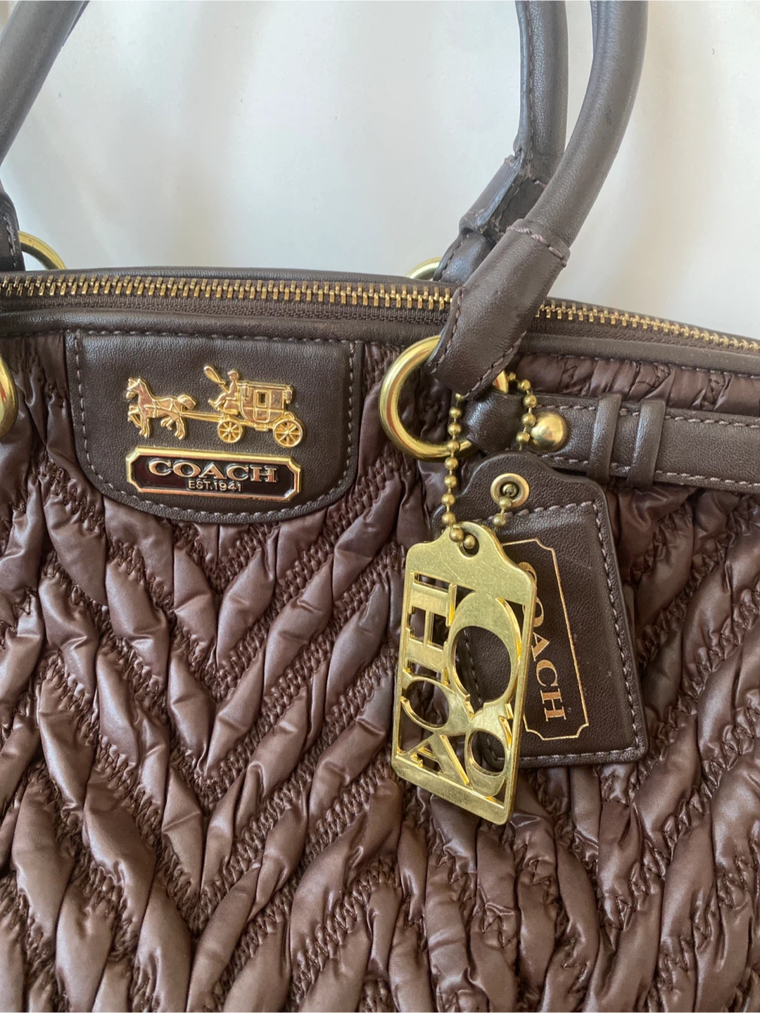This is a stylish Coach satchel purse in a rich brown colour. It features a ruched, quilted exterior with leather trim and gold-tone hardware. The bag has top handles and an optional shoulder strap for versatility. It's perfect for everyday use!