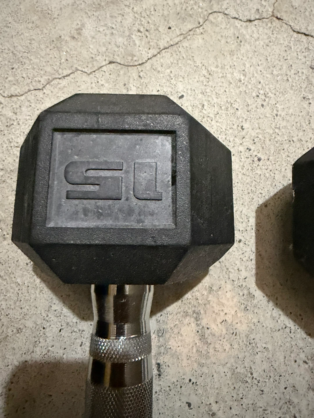 Selling a pair of 15 lb GoZone hex dumbbells. They have a knurled grip for better handling. Each dumbbell is 15 lbs.