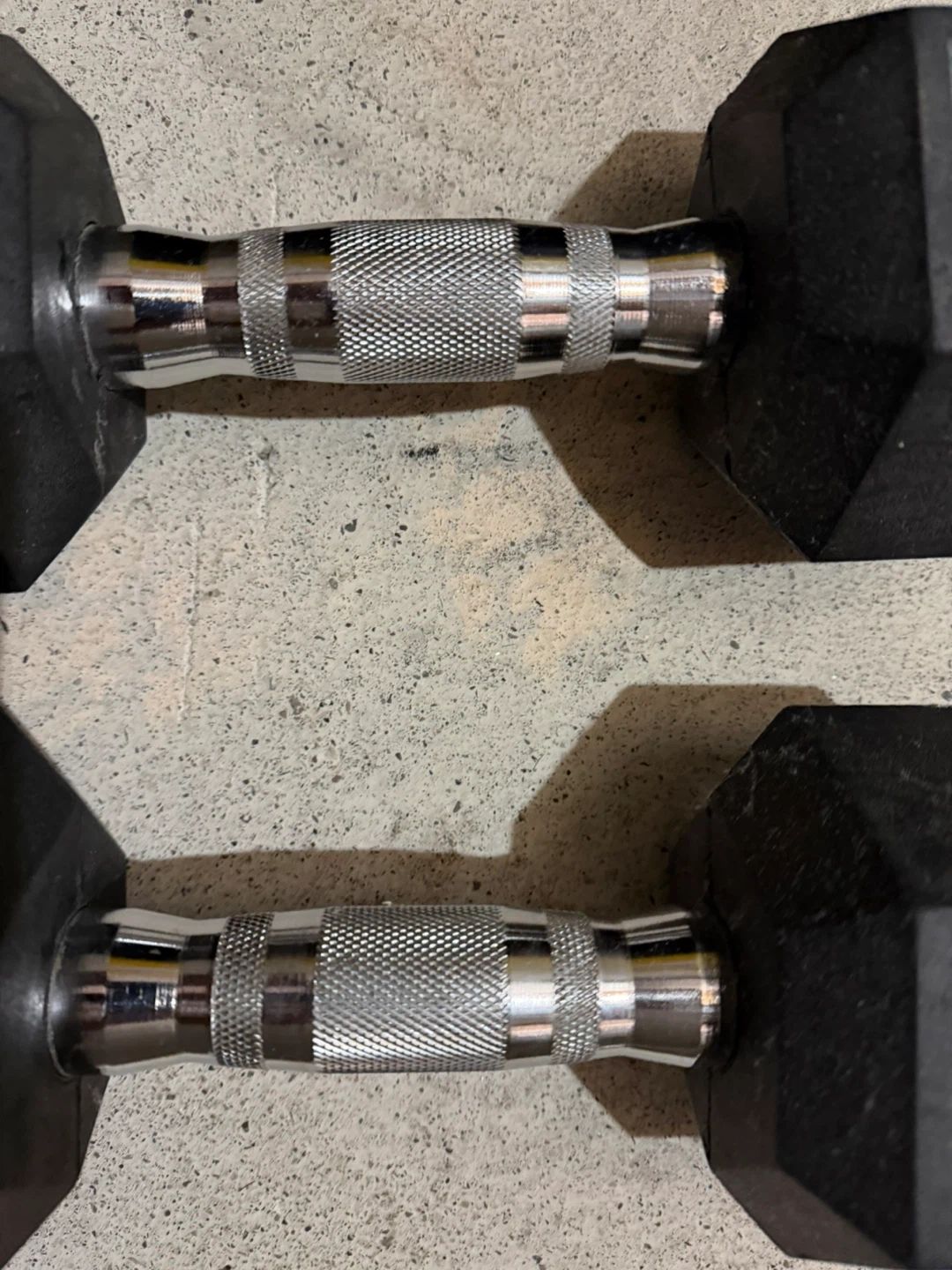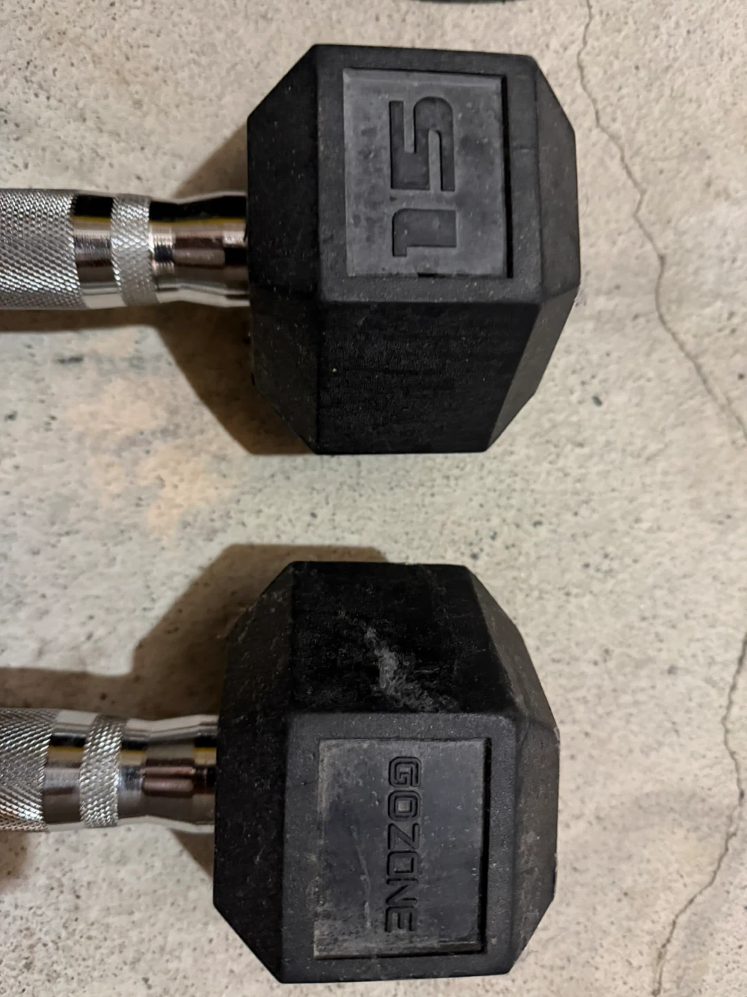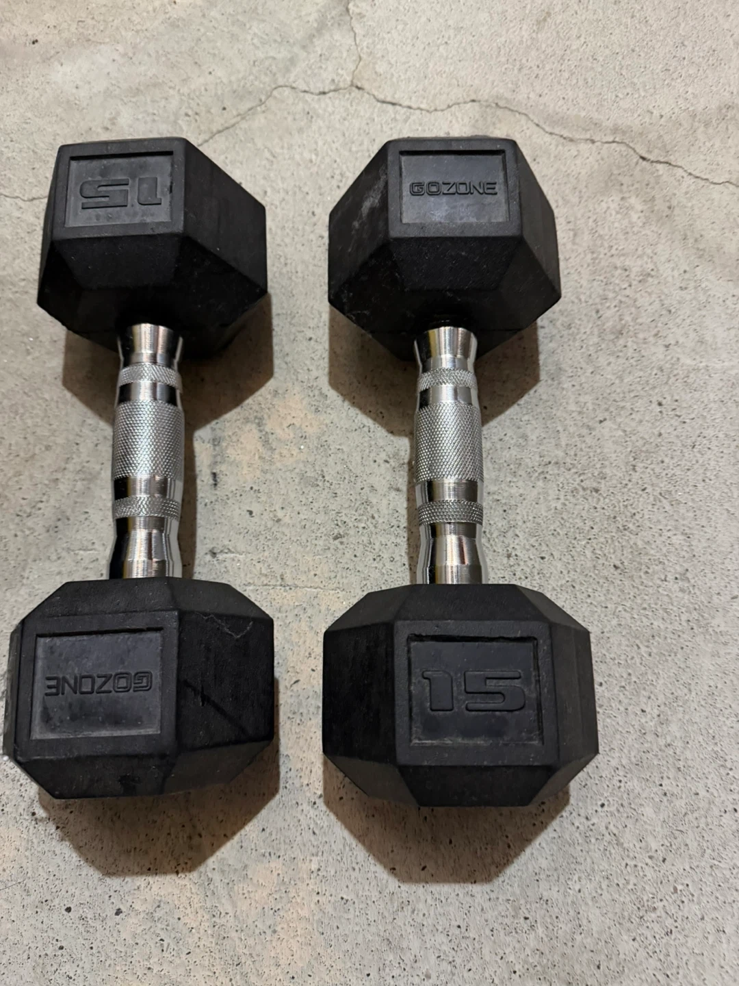 Selling a pair of 15 lb GoZone hex dumbbells. They have a knurled grip for better handling. Each dumbbell is 15 lbs.