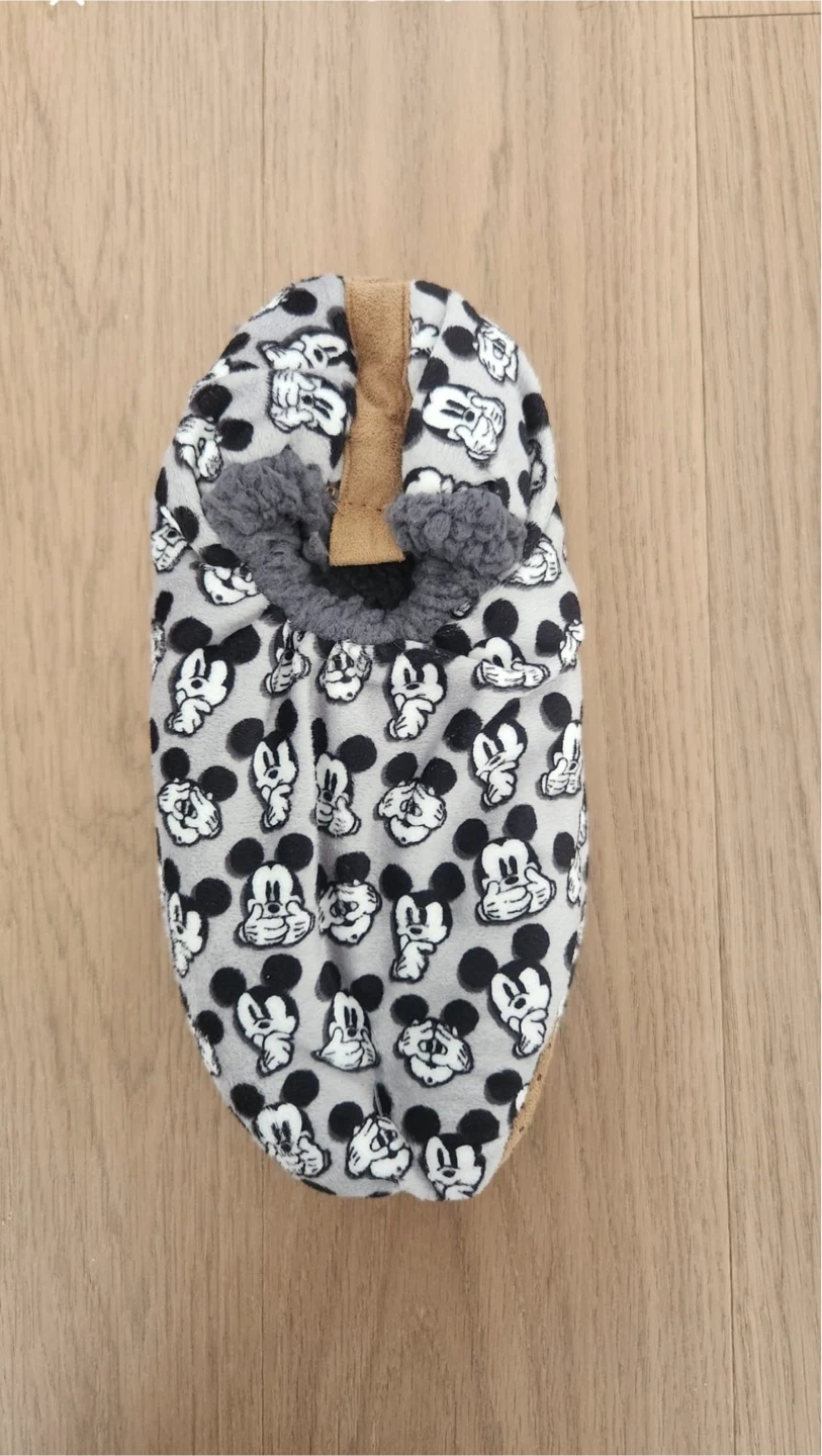 Disney Mickey Mouse fuzzy slipper socks. Soft grey fabric with a fun all-over Mickey print. Features a cozy Sherpa-style lining and grippy sole for traction. Perfect for keeping your feet warm and comfy!