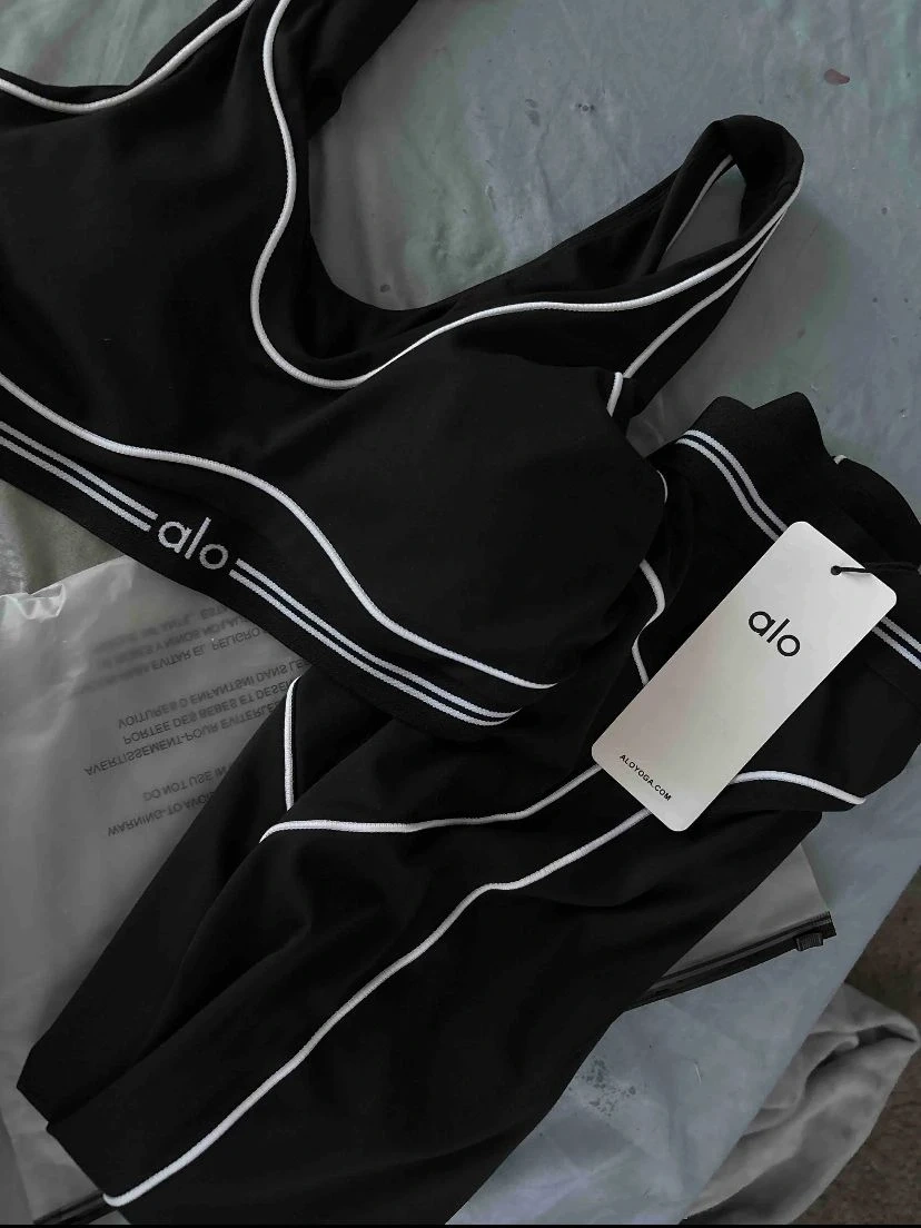 This Alo Yoga set includes a black sports bra and matching leggings with white trim detailing. Both pieces feature the Alo Yoga logo. Perfect for workouts or athleisure wear!