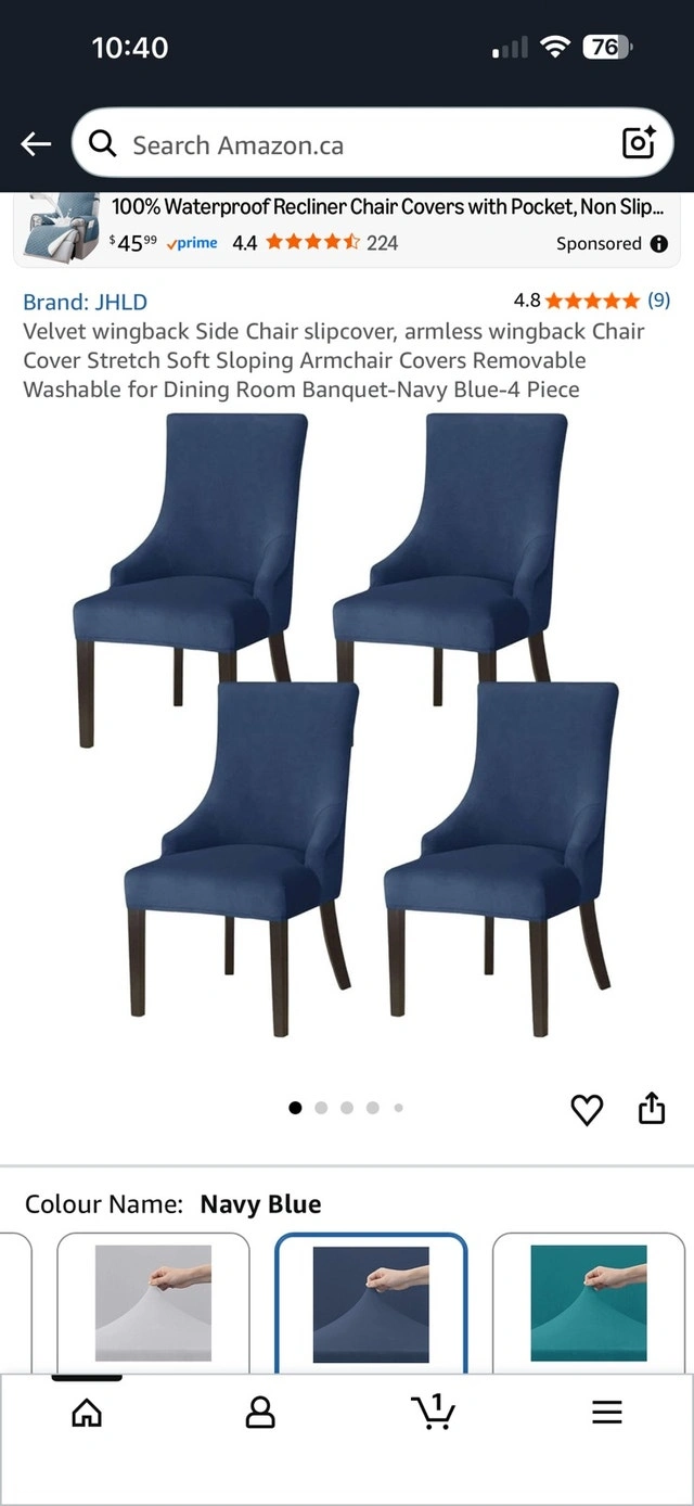 Give your dining room chairs a fresh, new look with these navy blue velvet chair covers. These covers stretch to fit armless wingback chairs, offering a soft and stylish makeover. They're easy to install and removable, making them a practical choice for protecting your chairs and updating your decor. This item is in used condition. Unfortunately, I don't have specific dimensions or material details available, but they're designed to fit standard side chairs. If you see this ad, these chair covers are still available, ready to transform your chairs! Cash accepted.