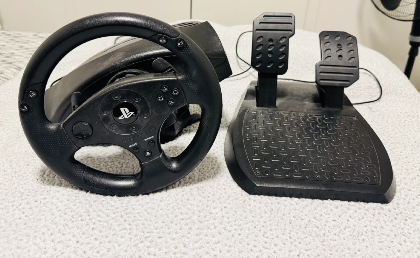 This is a Thrustmaster T80 racing wheel and pedal set, designed for PlayStation consoles. It features a realistic steering wheel with paddle shifters and a foot pedal set for gas and brake control. A great setup for racing game enthusiasts!