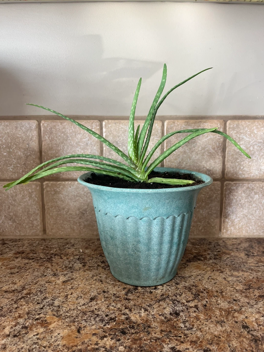 A healthy aloe vera plant potted in a green decorative planter. It's a lovely, low-maintenance addition to any home. Asking $10