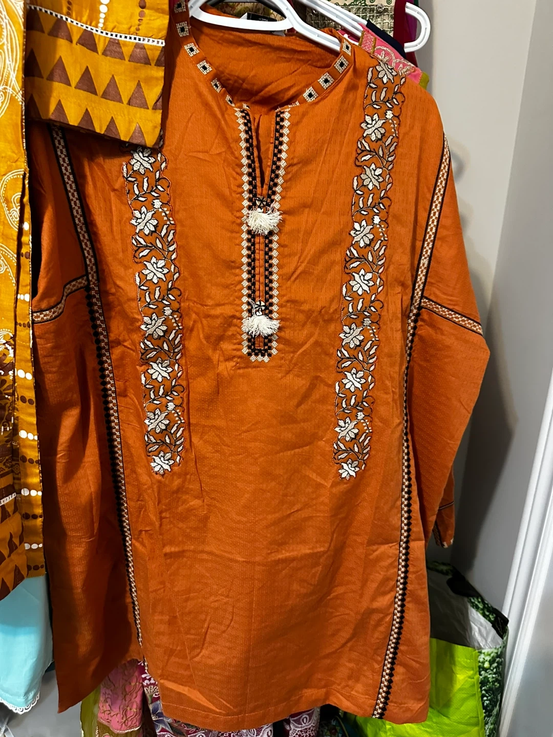 Selling a beautiful orange kurti with delicate white floral embroidery! It's in great condition and ready for a new home. The fabric has a nice texture, and the detailing along the neckline and sides adds a special touch. Perfect for adding a pop of colour to your wardrobe!