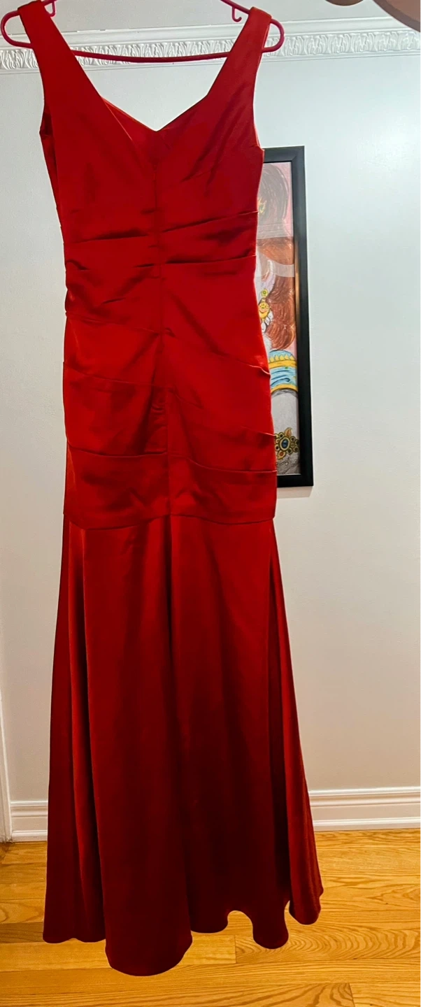 This elegant red formal gown features a flattering ruched bodice and a flowing skirt. Satin material. Perfect for special occasions!