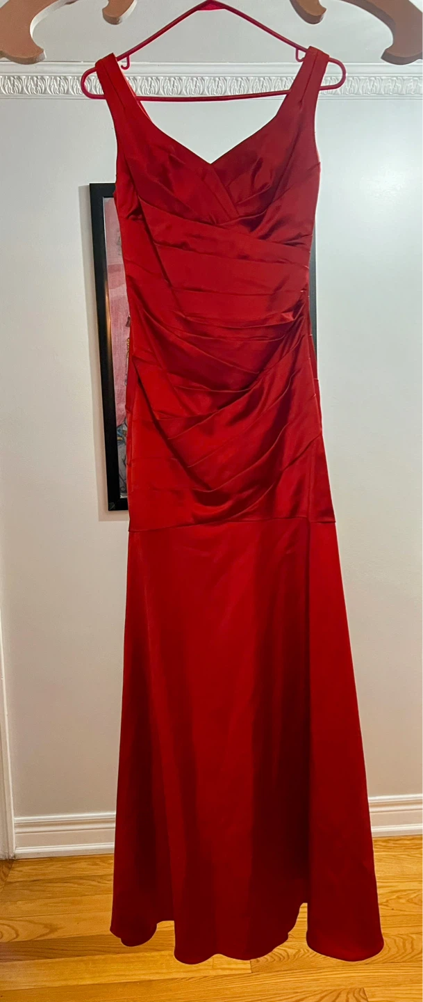 This elegant red formal gown features a flattering ruched bodice and a flowing skirt. Satin material. Perfect for special occasions!