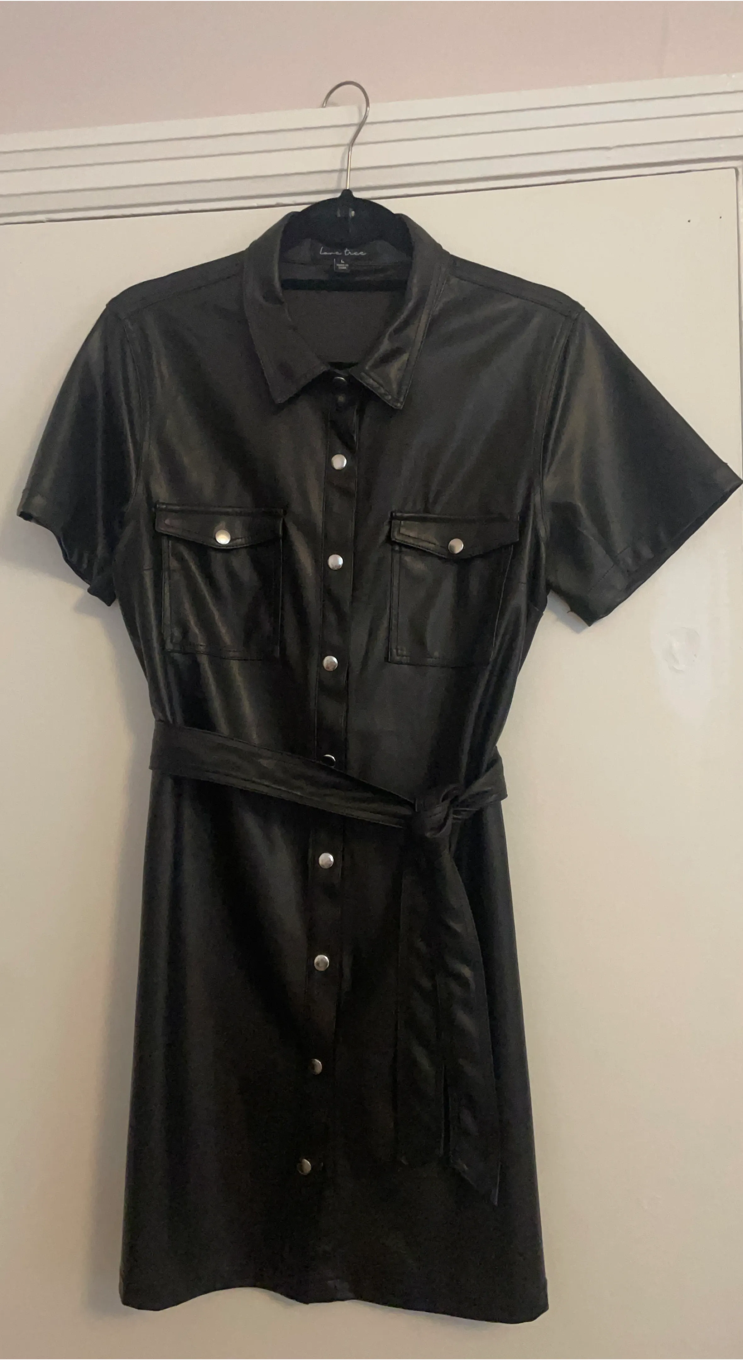 An edgy black faux leather dress/shirt from Love Tree. It's size large with short sleeves and a matching belt.