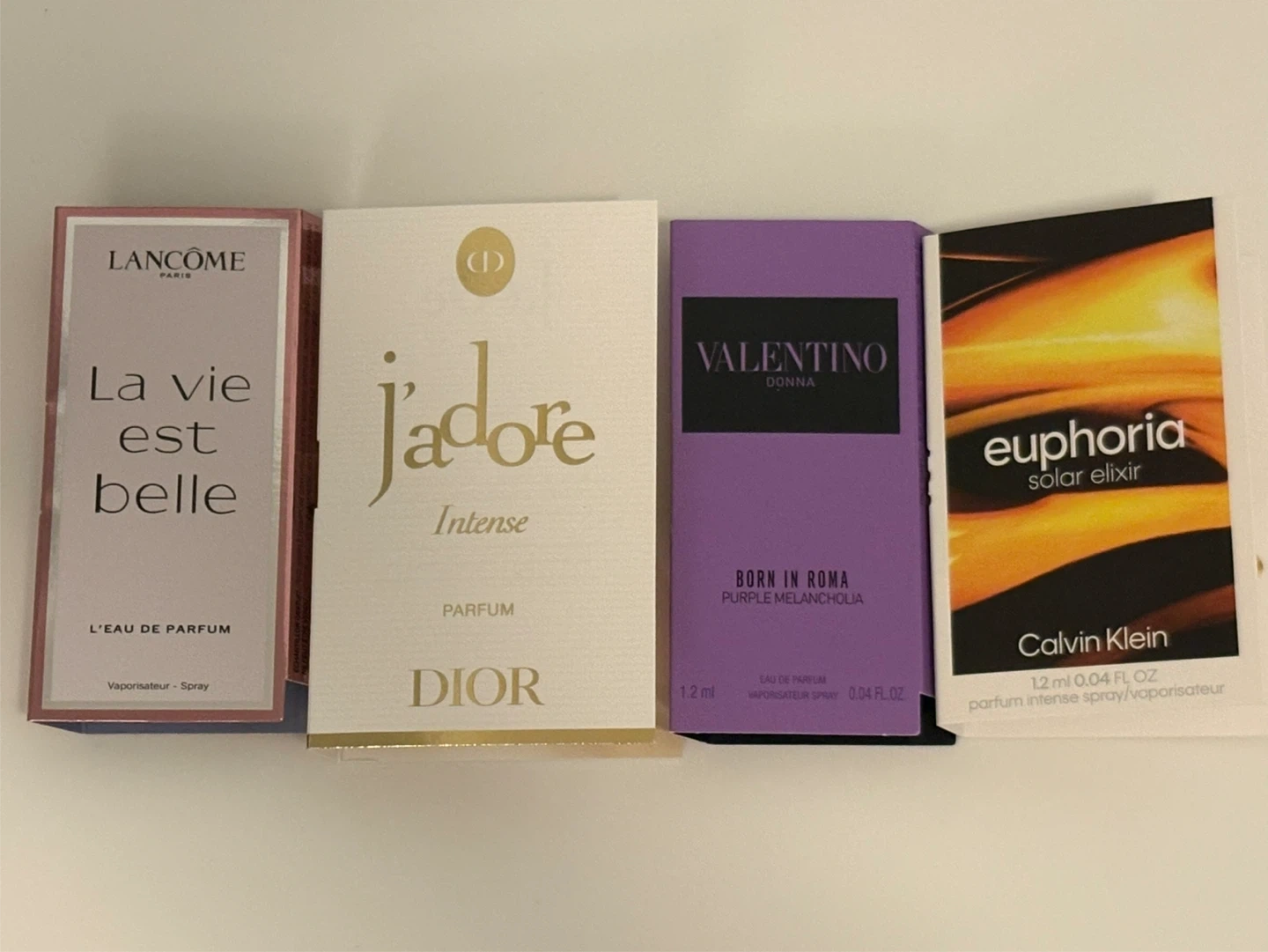 Four designer perfume samples included. Features Lancome La vie est belle, Dior J'adore Intense, Valentino Born in Roma Purple Melancholia, and Calvin Klein Euphoria Solar Elixir.