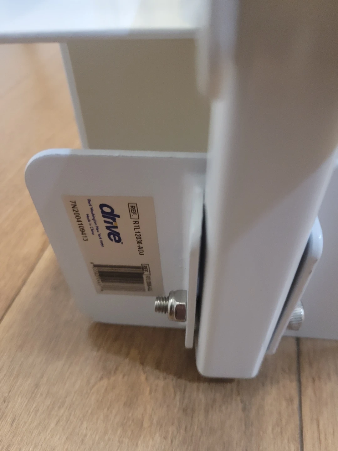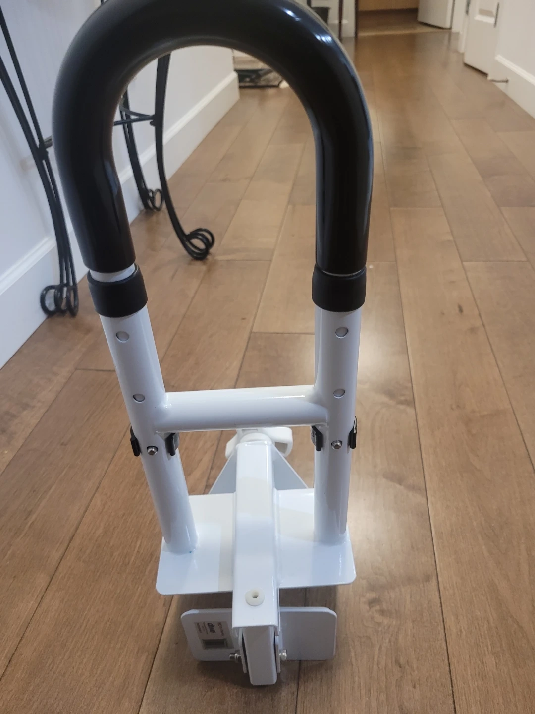 This is a Drive bathtub safety rail, model RTL2003S-ADJ. It's white with black grip handles. This rail helps provide extra stability when getting in and out of the tub. It adjusts to fit most tubs.