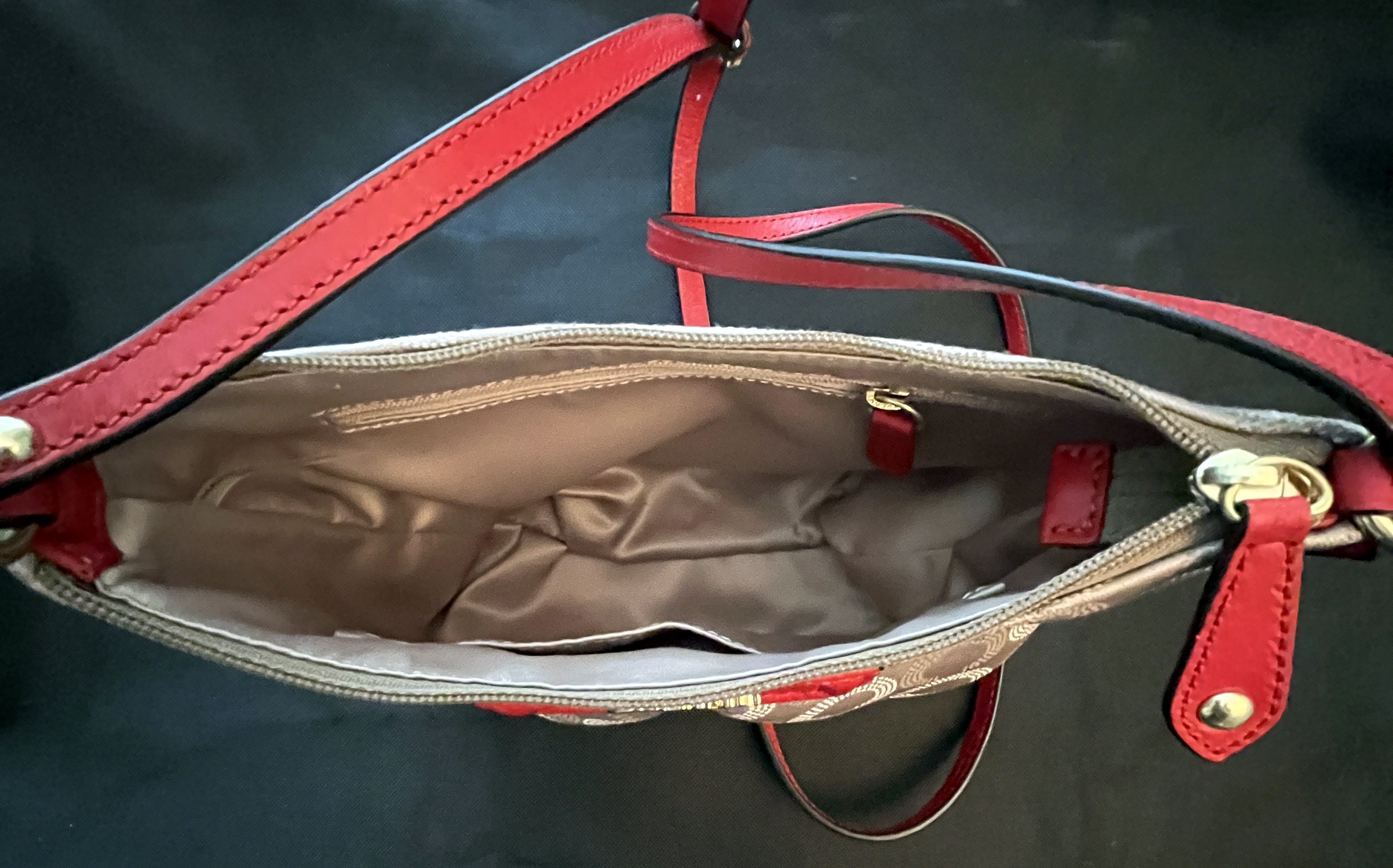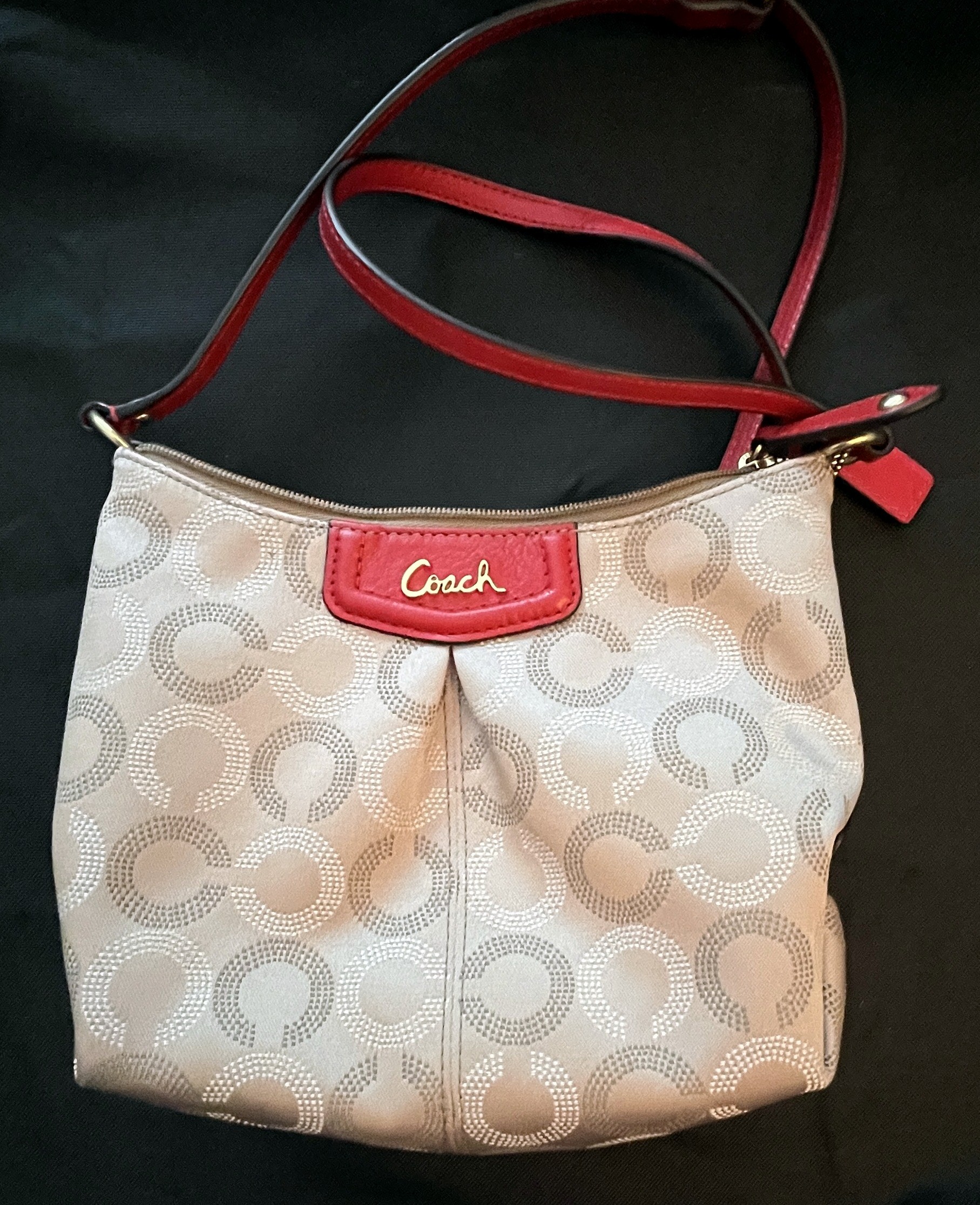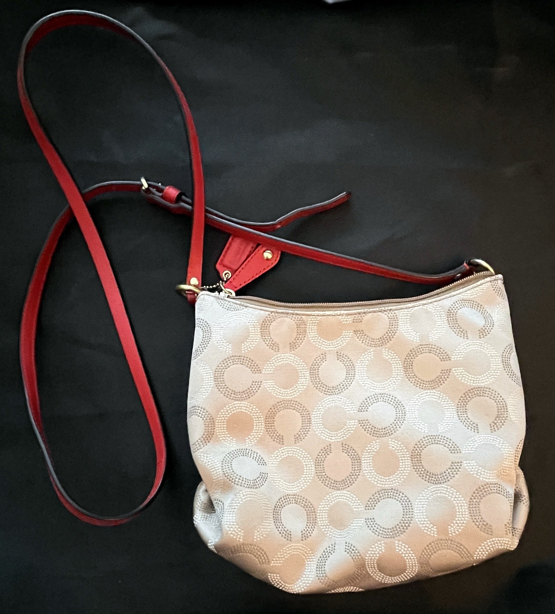 Selling a cute Coach crossbody bag! It's beige with a red strap and detailing. The pattern is a repeating Coach logo. It's in great shape and ready for a new home!