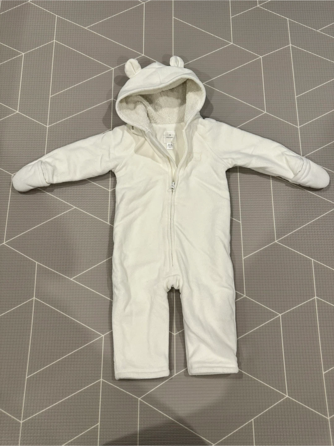 It's in great condition and perfect for keeping your little one warm and cozy. The material is soft and cuddly, and the bear ears on the hood are just adorable!