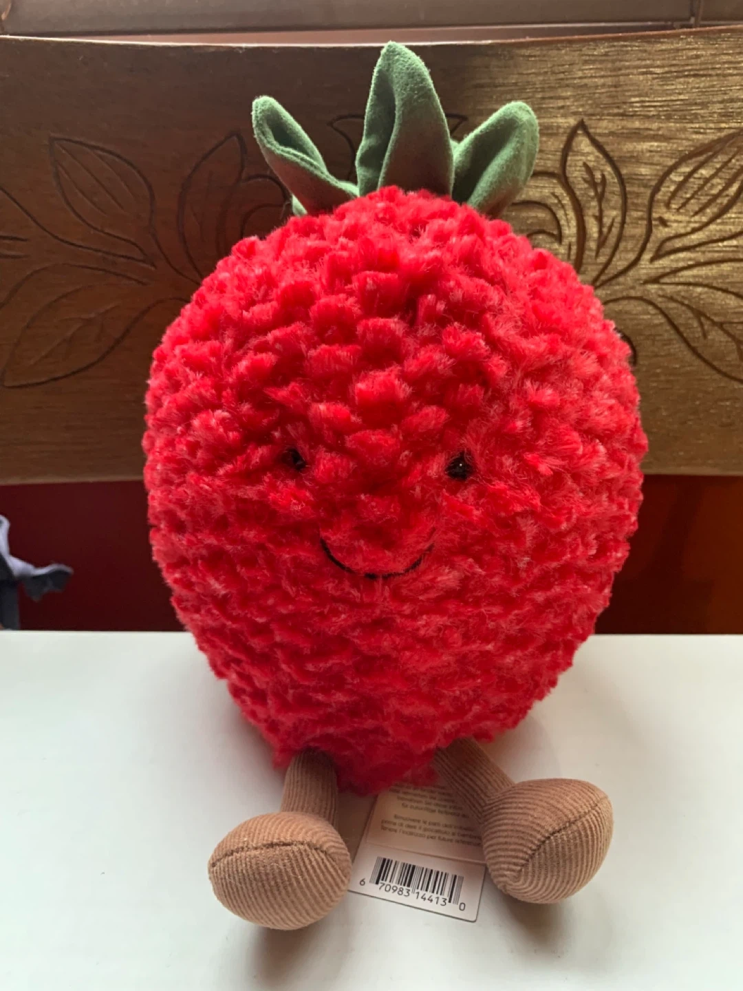 This is a Jellycat Amuseables Strawberry plush. It's super soft and cuddly with a friendly face and corduroy legs. Perfect for strawberry lovers of all ages!