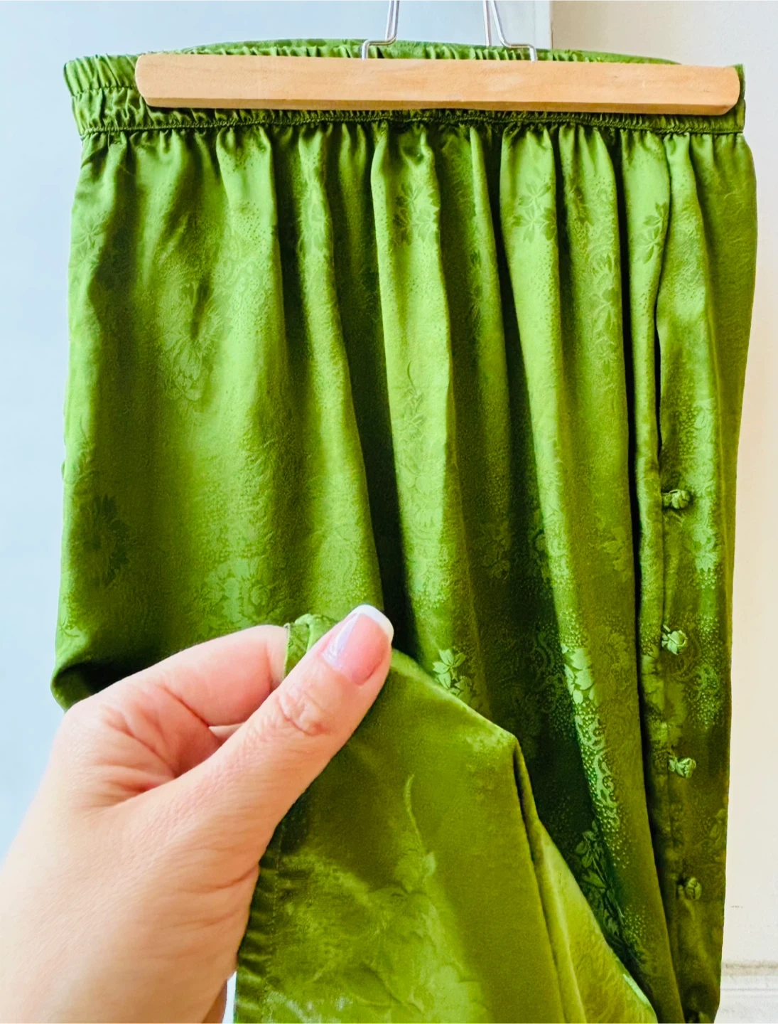 Lovely olive green 100% silk skirt! This is a feminine and well-made piece with all natural materials! (Brand new with tag!) it has nice floral pattern throughout,two side pockets and a comfortable elastic waistband!!😁