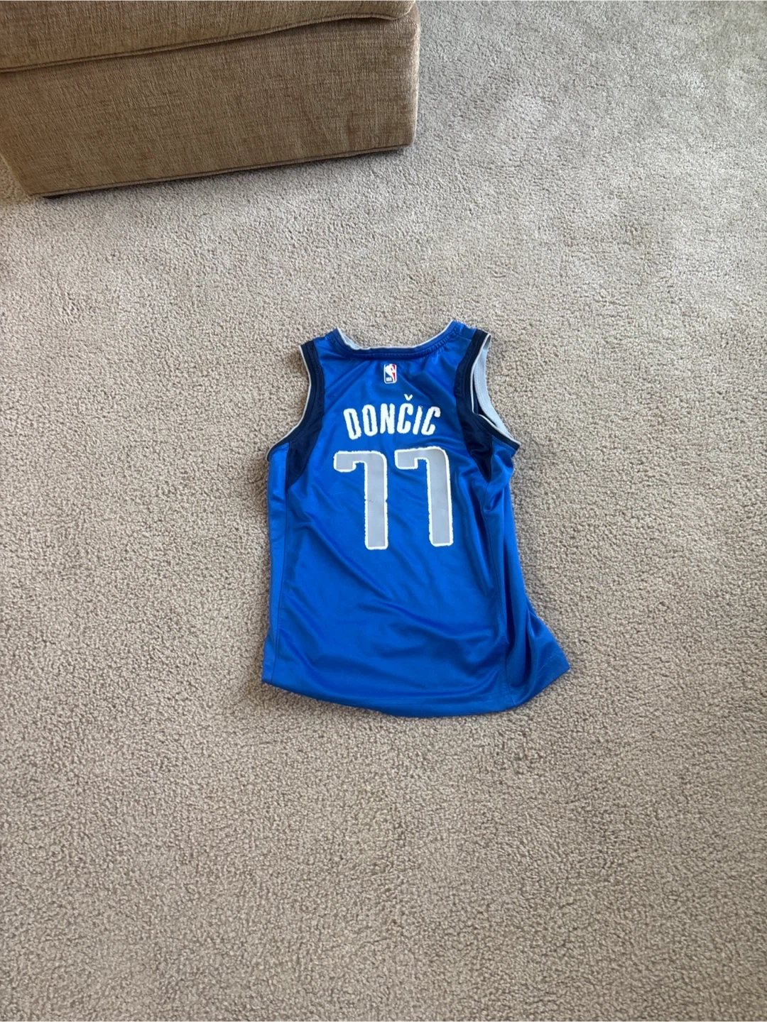 Fanatics Dallas Mavericks jersey with Luka Doncic #77. Blue color. Men's size S. Made in Guatemala.