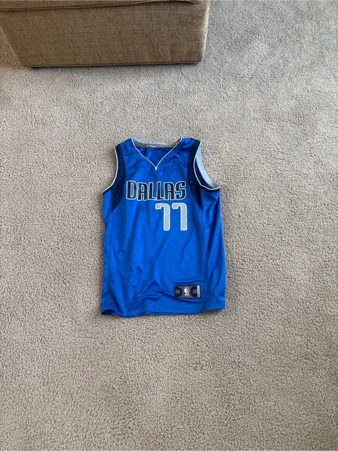 Fanatics Dallas Mavericks jersey with Luka Doncic #77. Blue color. Men's size S. Made in Guatemala.