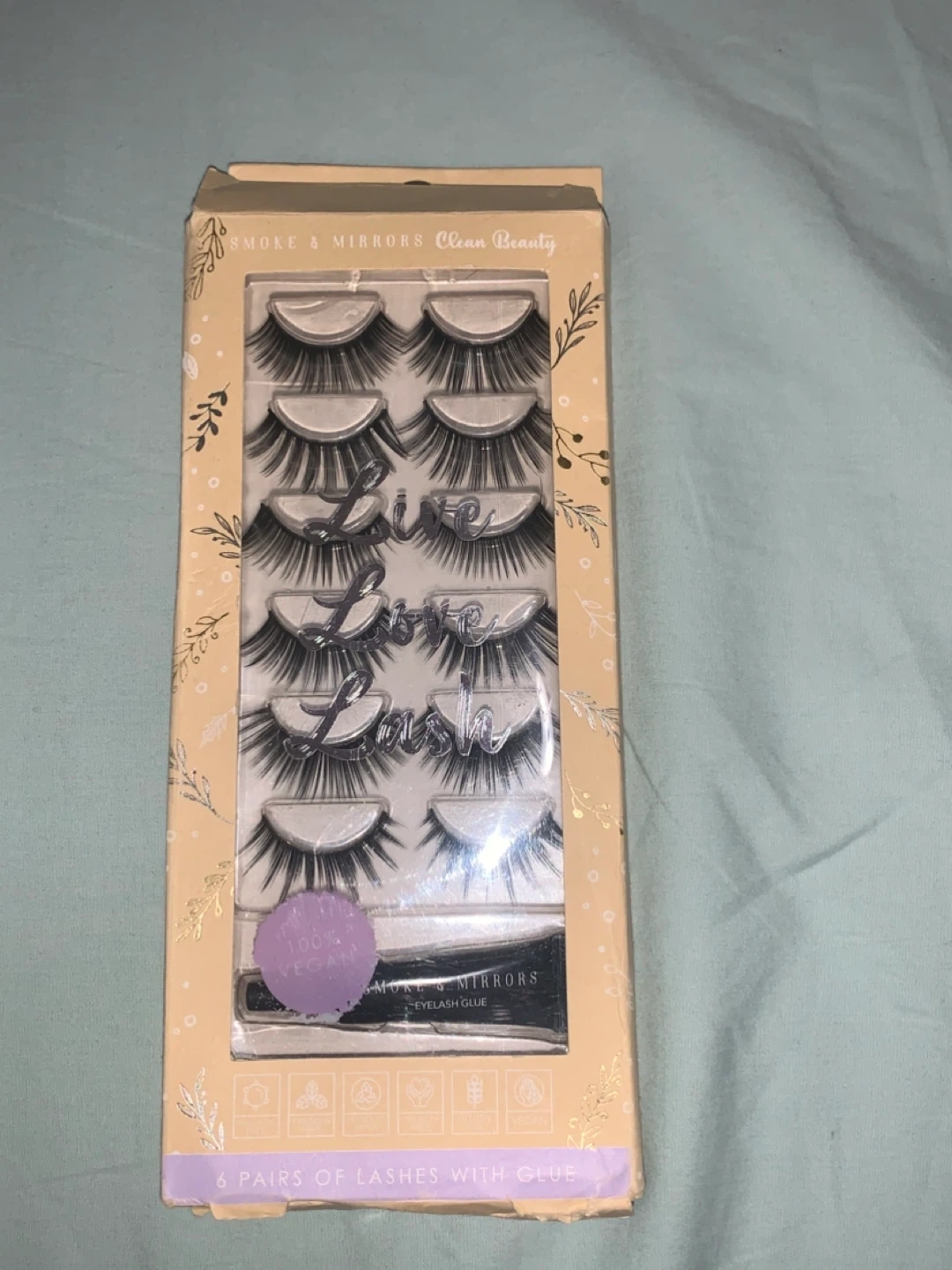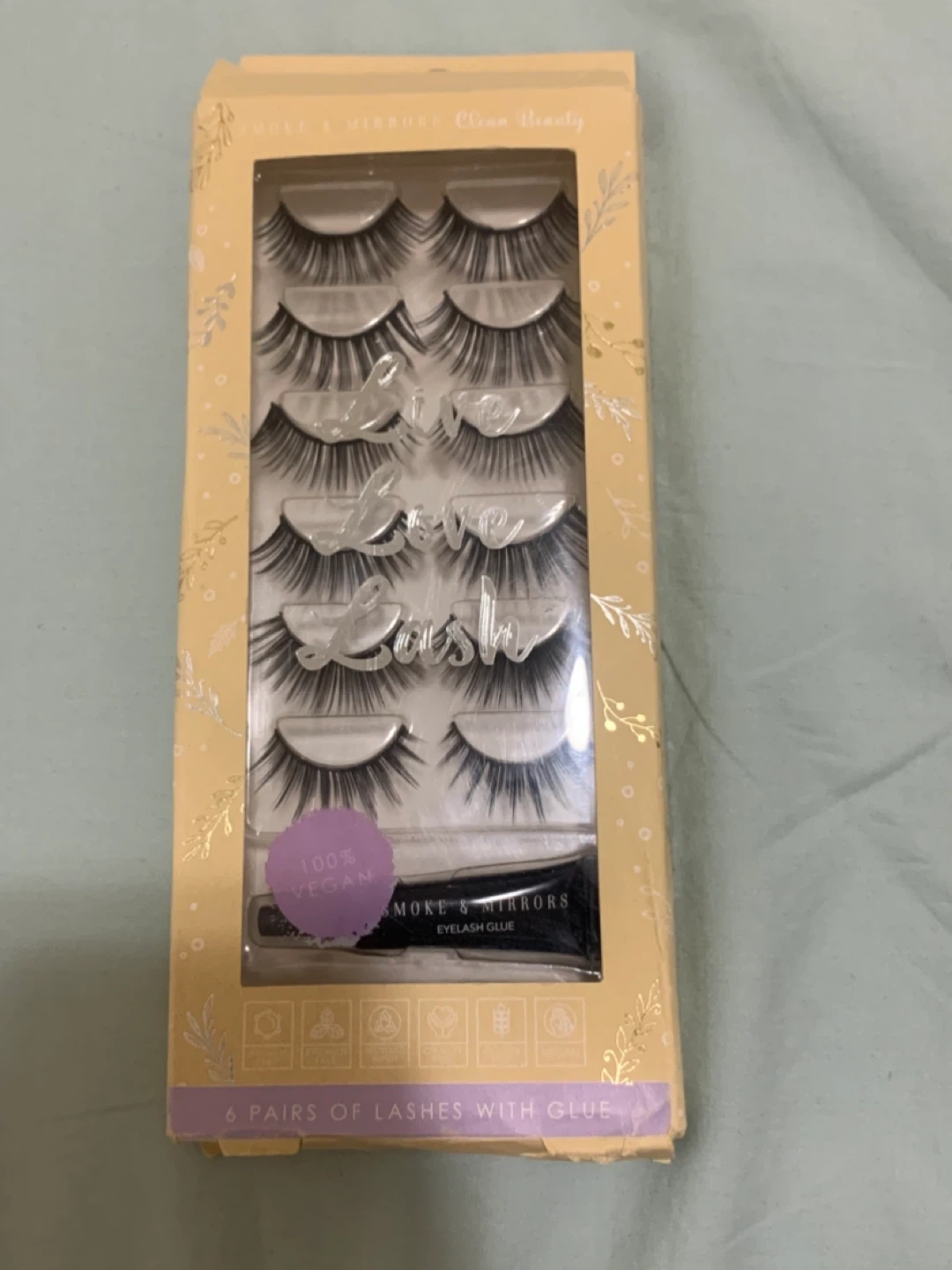 This Moke & Mirrors lash kit includes 6 pairs of false eyelashes and eyelash glue. They're 100% vegan. Great for achieving a fuller lash look!