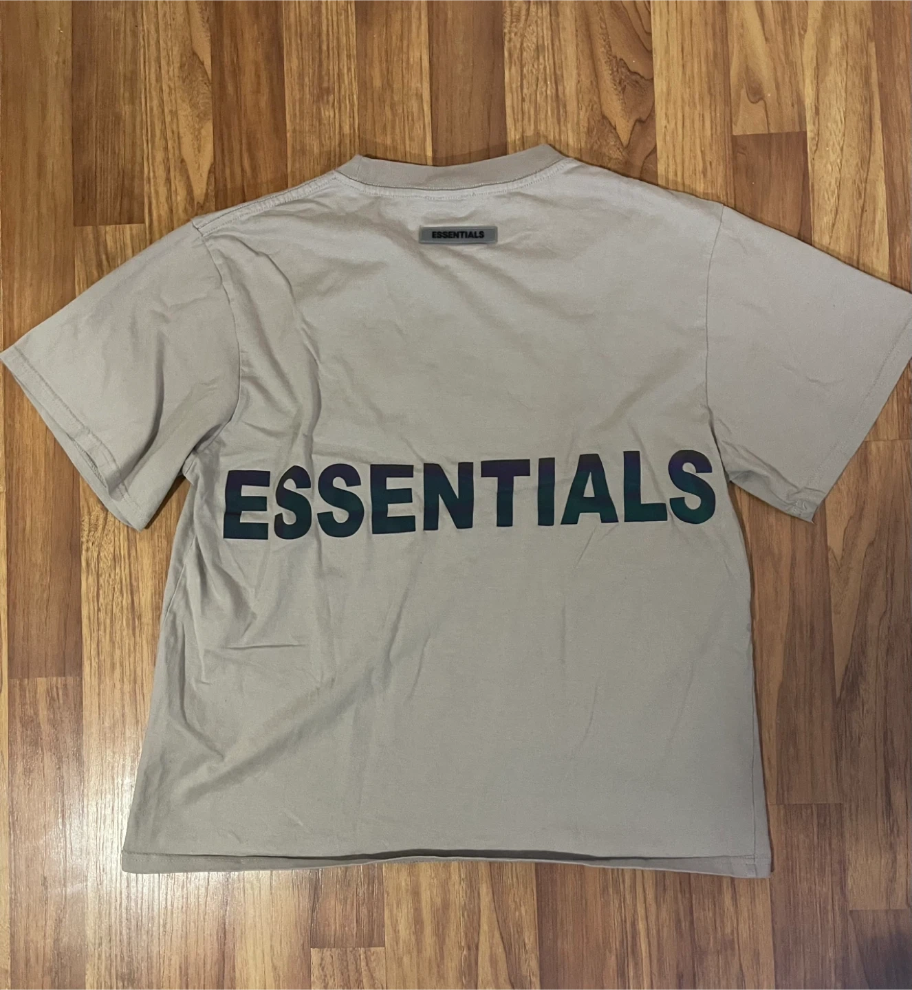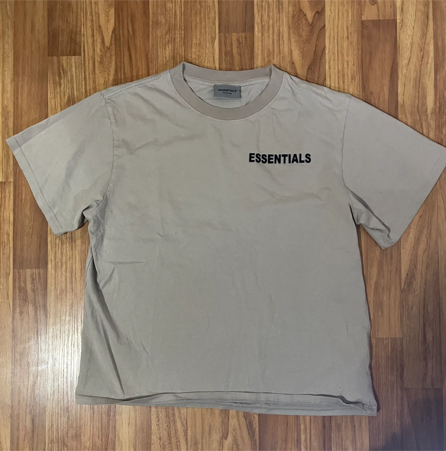 Selling an Essentials t-shirt in a neutral beige colour. It's a size large and in great condition. The design features the Essentials logo on the front and back. Perfect for casual wear!