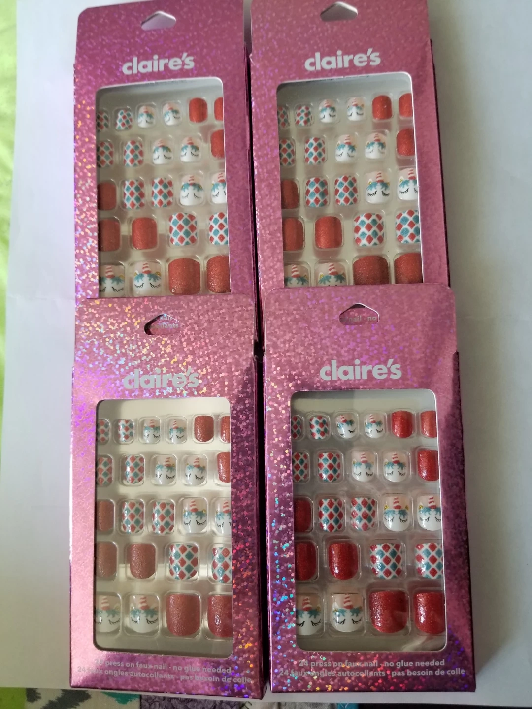 These are four packs of Claire's press-on faux nails. Each pack contains 24 nails and requires no glue. They feature a mix of unicorn designs, red glitter, and a red and blue diamond pattern. Brand new