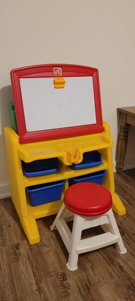 Includes a dry erase board, a storage unit with bins, and a stool. Some minor wear and tear.