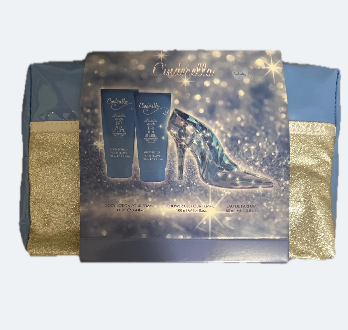 Cinderella-themed gift set. Includes body lotion, shower gel, and eau de parfum. Packaged in a blue cosmetic bag with glittery accents.