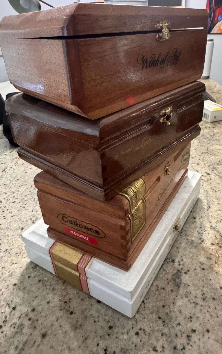 Collection of wooden and white cigar boxes. Includes brands like Don Carlos, Cañonès, Hemingway, and Le Bijou. Boxes are made from wood and white material. Some have decorative labels and metal latches.
