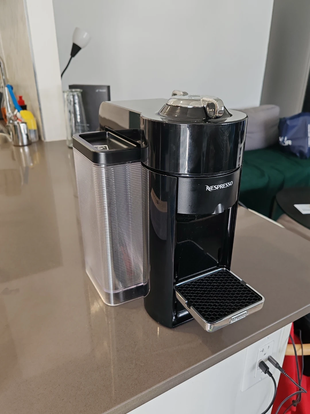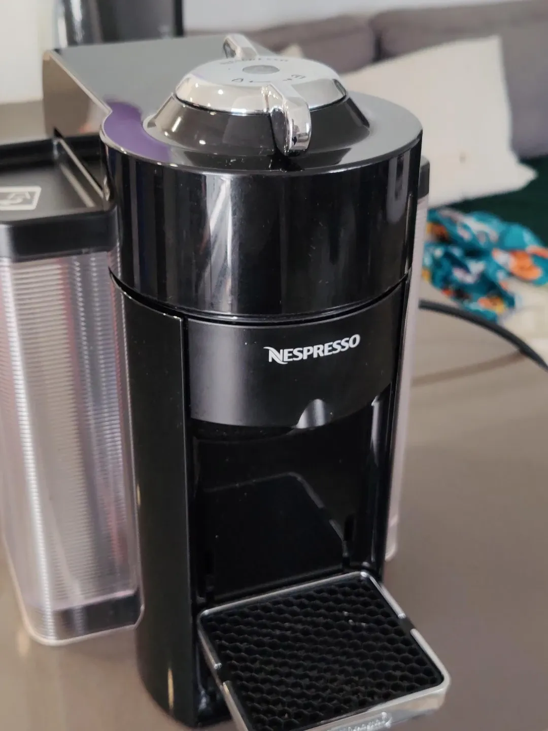 This is a black Nespresso Vertuo coffee maker. It's a compact machine perfect for making single servings of coffee. It comes with a water reservoir, a used pod container and 12 Nespresso pods