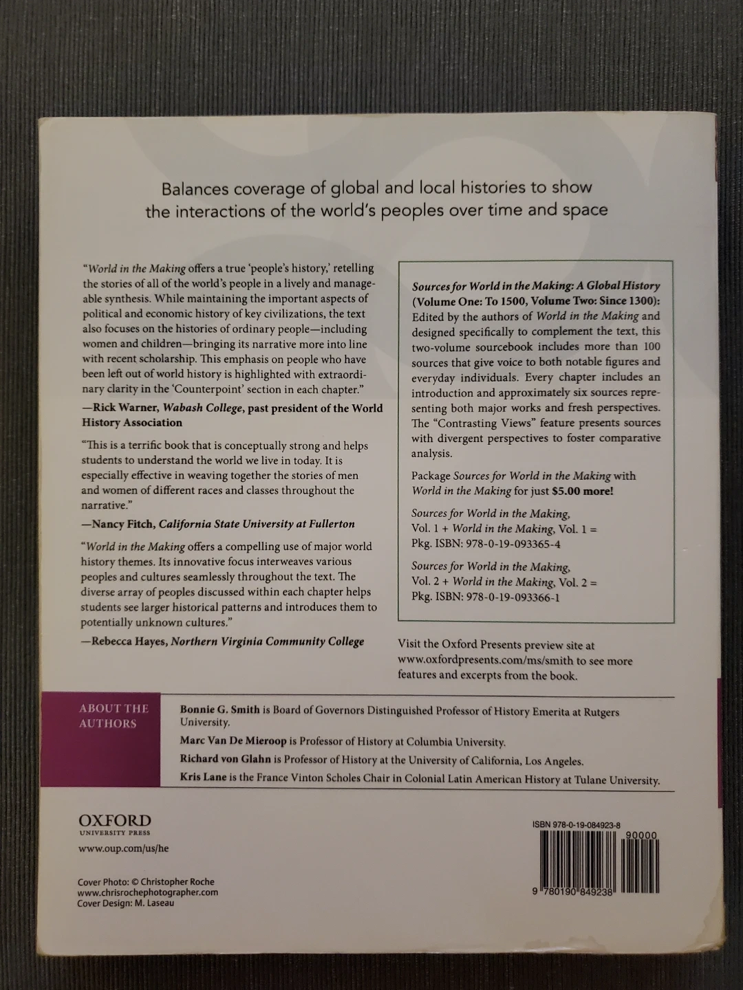 This textbook covers World in the Making, a global history focusing on volume one, from its origins to 1500. It's written by Bonnie G. Smith, Marc Van De Mieroop, Richard von Glahn, and Kris Lane. The book includes sources and analyses from different perspectives.