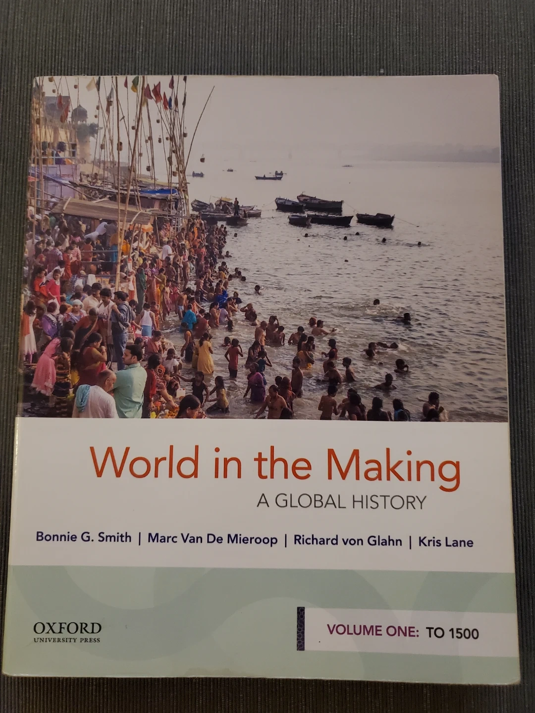 This textbook covers World in the Making, a global history focusing on volume one, from its origins to 1500. It's written by Bonnie G. Smith, Marc Van De Mieroop, Richard von Glahn, and Kris Lane. The book includes sources and analyses from different perspectives.