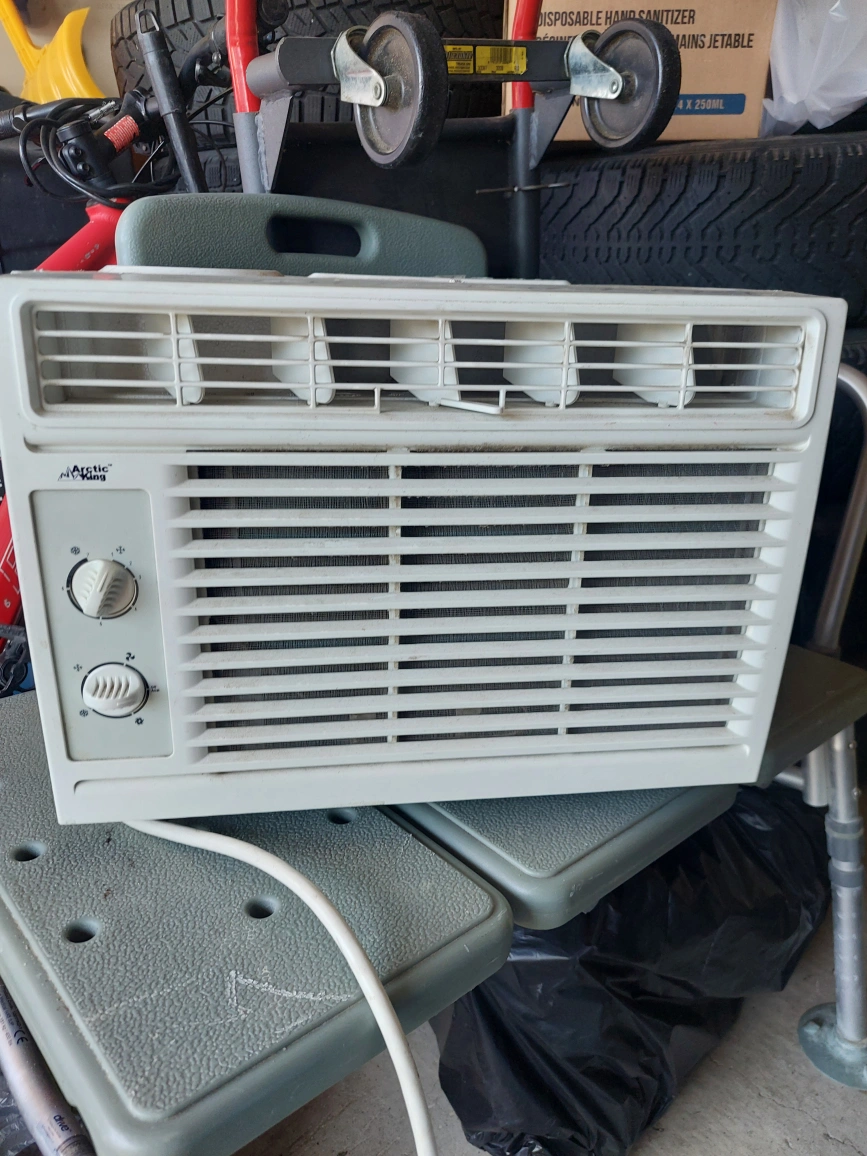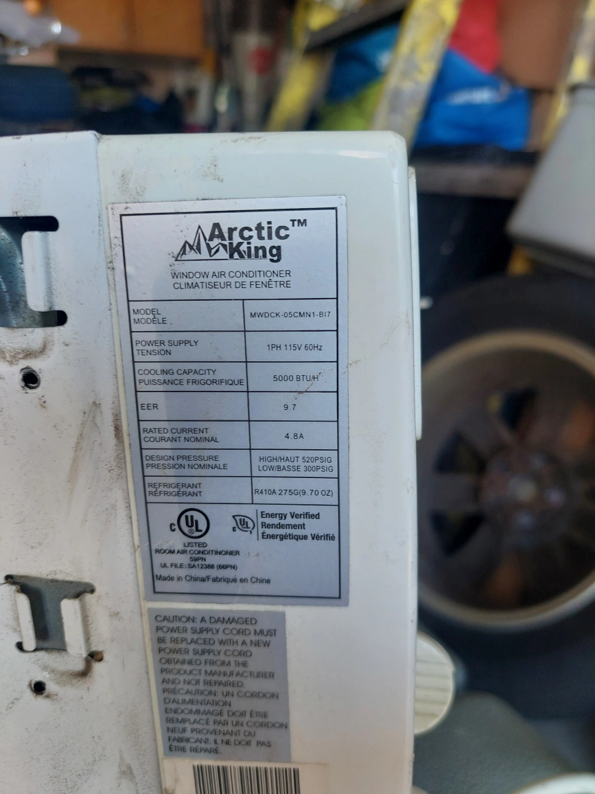 Selling an Arctic King window air conditioner. It has a cooling capacity of 5000 BTU/h and operates on 115V 60Hz power supply. Model number is MWDCK-05CMN1-B17