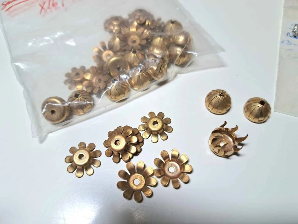 Silver plated set with hooks, 4 pieces per bag. Two are 1960's style! Measures 3.65 cms. These are large, suitable for big beads. Also includes a bag of brass fittings/settings for soft soldering costume jewelry, in 7mm & 12mm sizes.