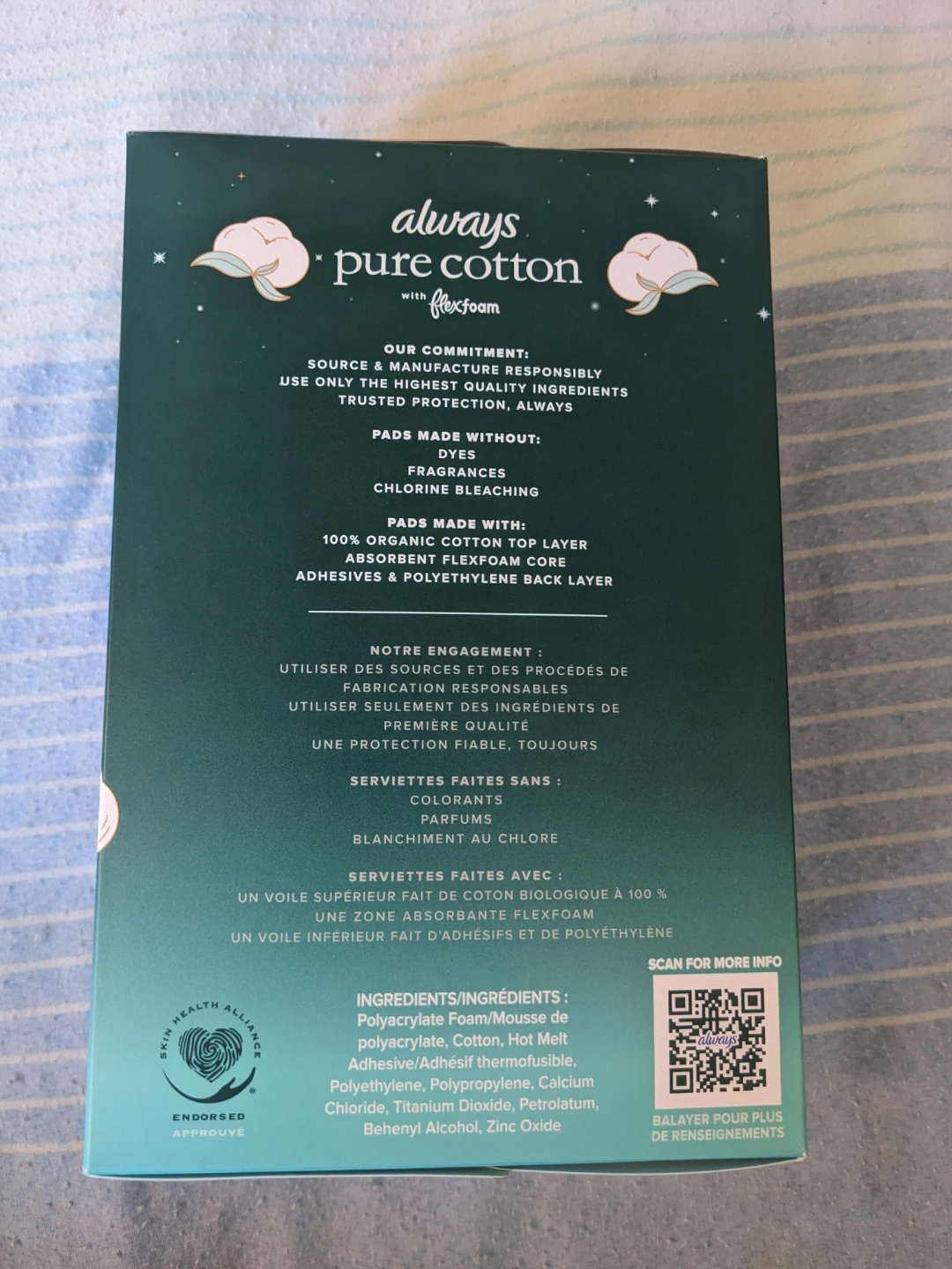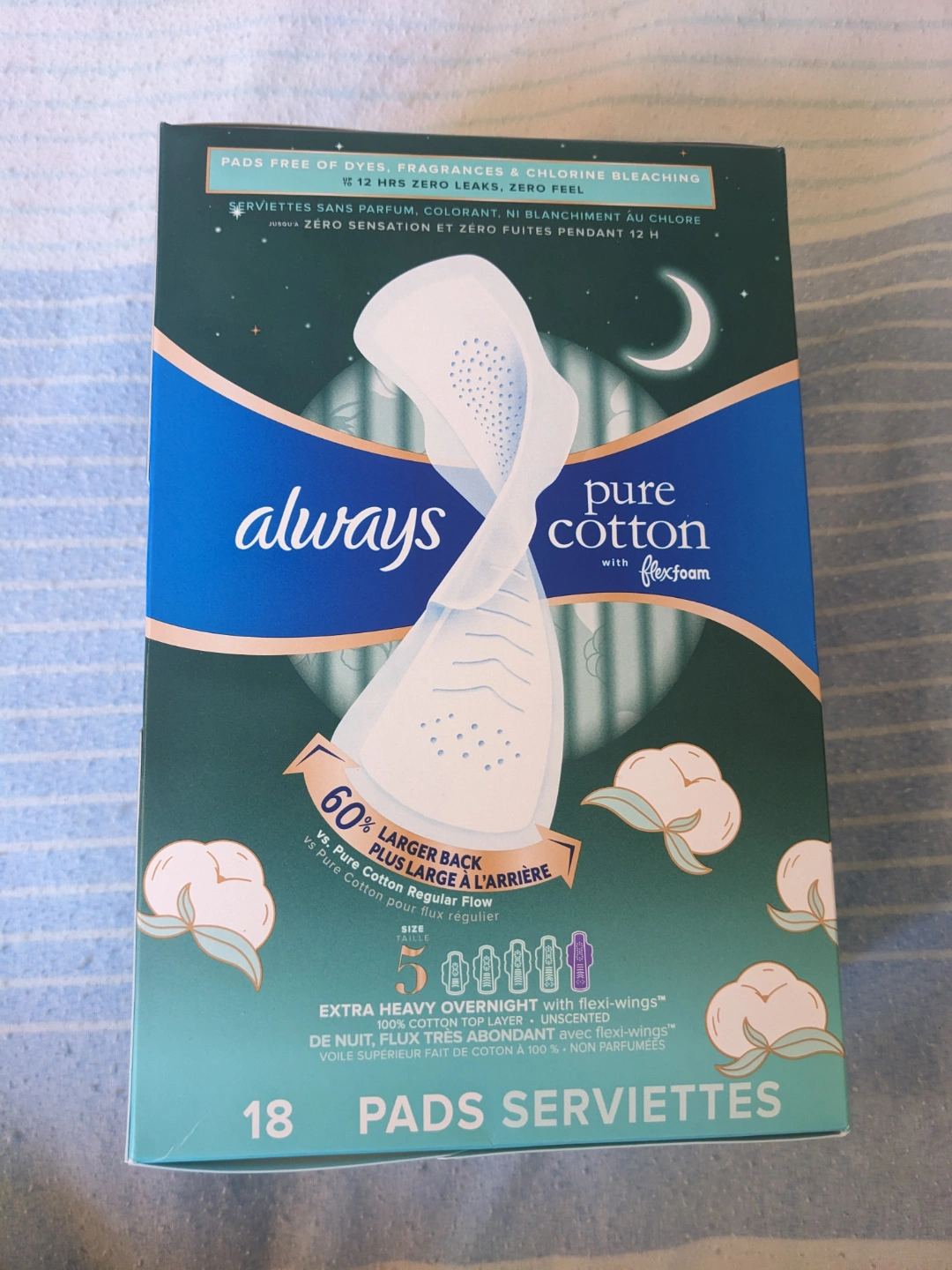 18 pads. Unscented. Extra heavy overnight. 100% premium cotton top layer. Flexi-wings. Absorbent core. Form-fitting grooves. 12 hours zero leaks, zero feel. Pads free of dyes, fragrances & chlorine bleaching. Unused/unopened/brand new!