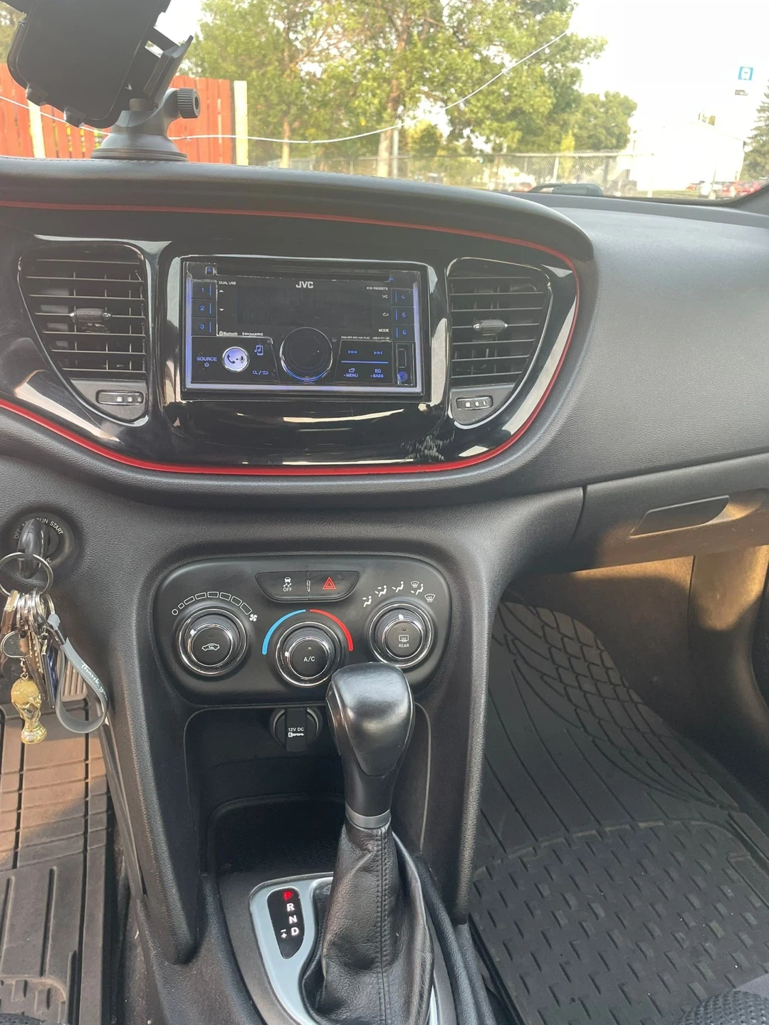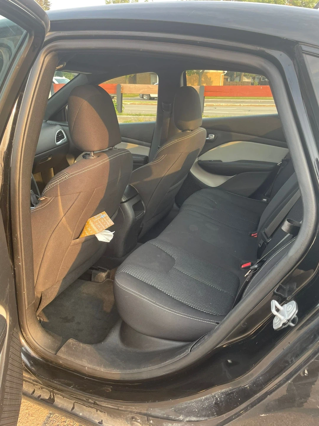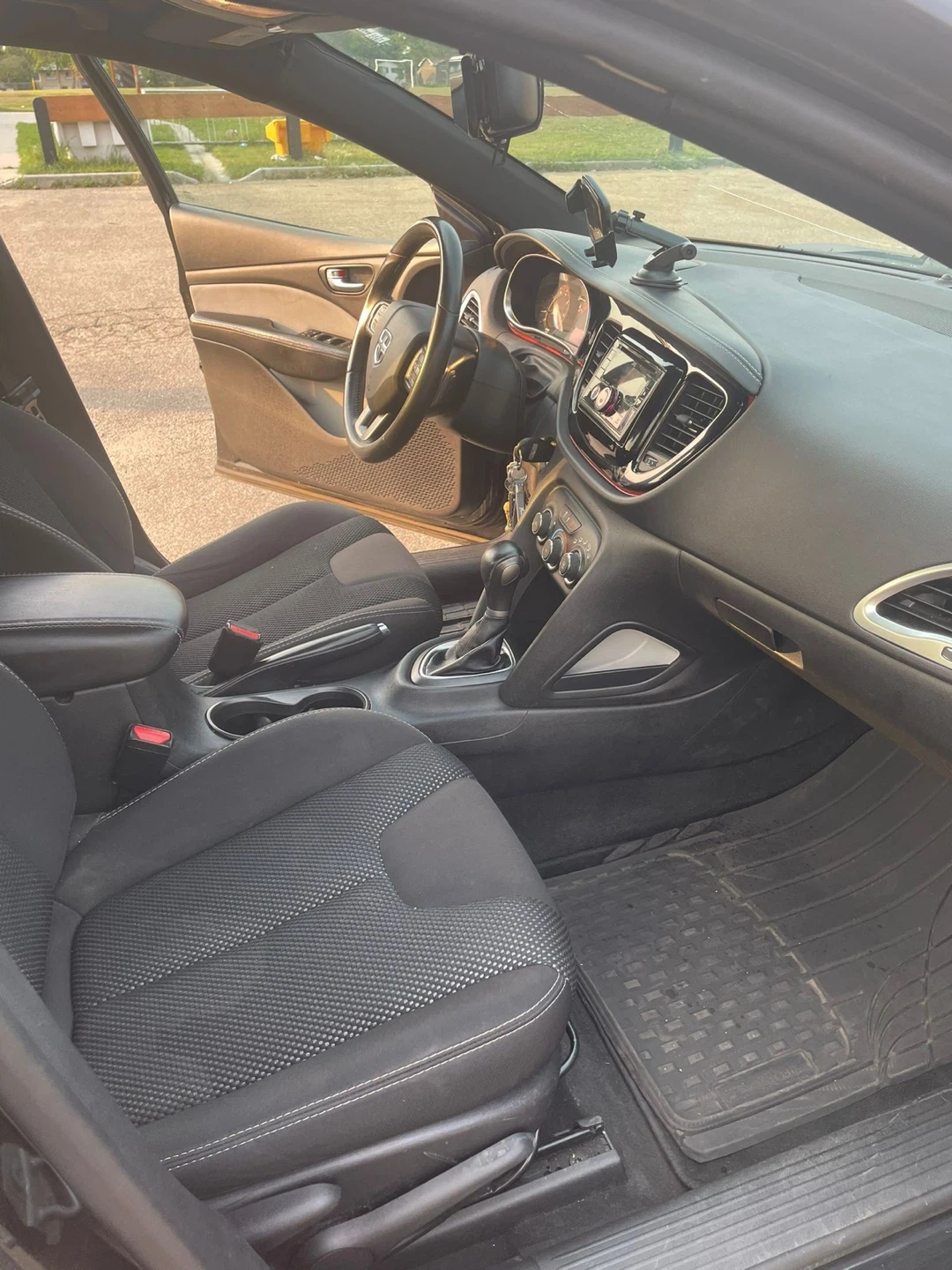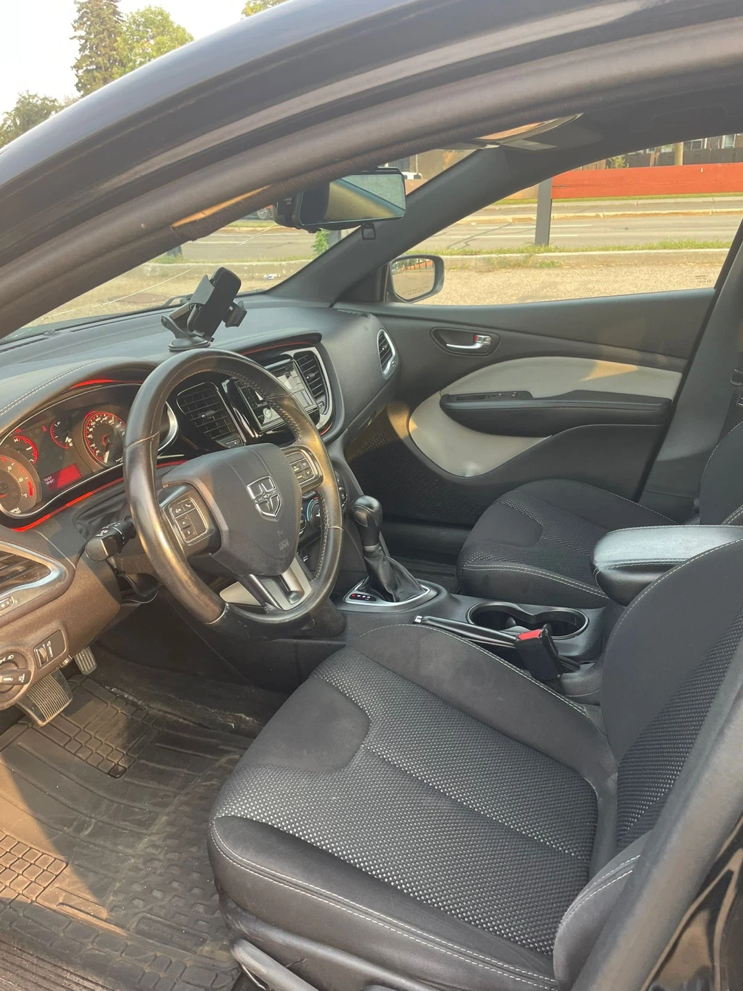 This is a black Dodge Dart. It's a four-door vehicle with black interior and cloth seats. and has an automatic transmission. It's a reliable car for daily commuting.