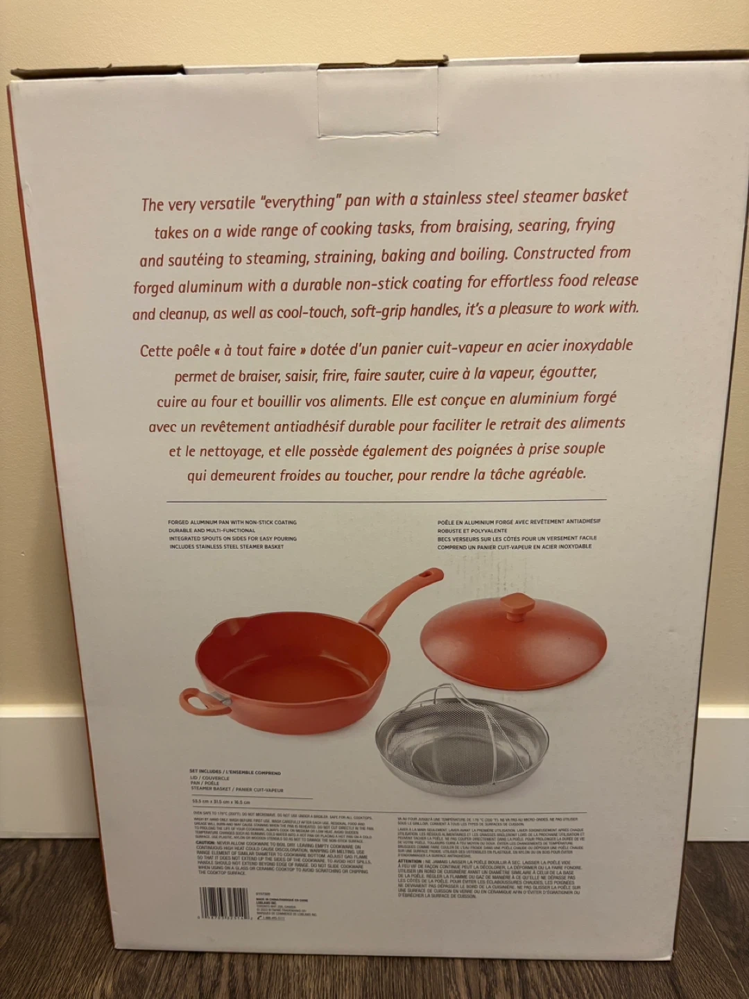 I'm selling a brand new President's Choice 8-in-1 Everything Pan! It's still in its original box and has never been used. This versatile pan can handle all sorts of cooking tasks, from braising to steaming.